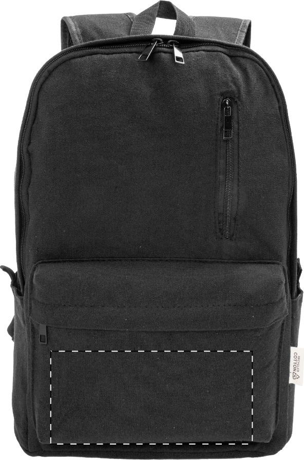 Recyklovaný plátěný batoh s hlavní přihrádkou na zip, polstrovanou přihrádkou na notebook (15"), 2 předními kapsami na zip, bočními kapsami, popruhem na kolečkách, polstrovanými zády a ramenními popruhy. 70% recyklované bavlny a 30% RPET polyesteru. S výrazným štítkem recyklované bavlny.