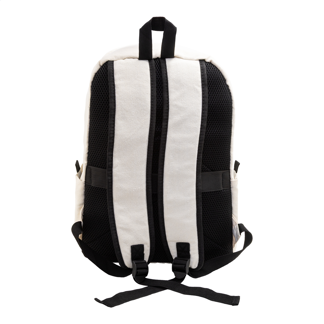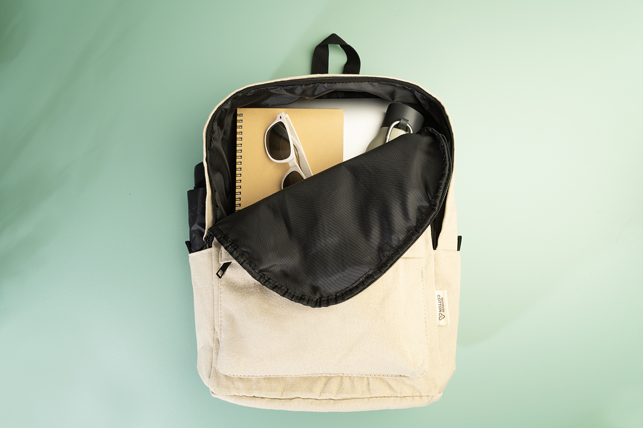 Recyklovaný plátěný batoh s hlavní přihrádkou na zip, polstrovanou přihrádkou na notebook (15"), 2 předními kapsami na zip, bočními kapsami, popruhem na kolečkách, polstrovanými zády a ramenními popruhy. 70% recyklované bavlny a 30% RPET polyesteru. S výrazným štítkem recyklované bavlny.