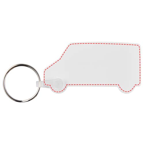 Bílá klíčenka ve tvaru dodávky s kovovým kroužkem. Kovový kroužek má plochý profil, který je ideální pro korespondenci.