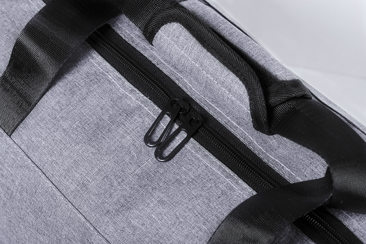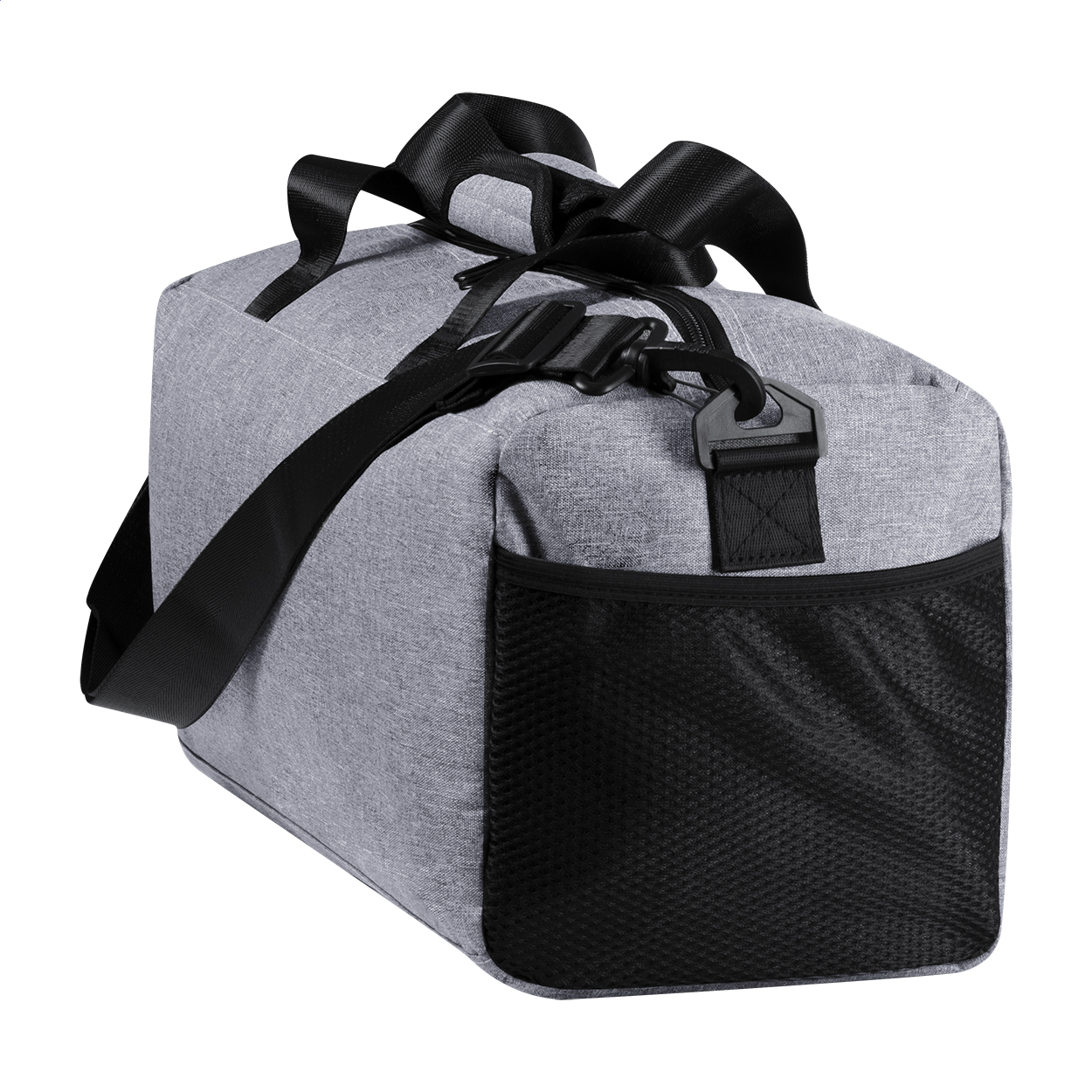 Sportovní taška na zip s bočními kapsami ze síťoviny a s nastavitelným ramenním popruhem. Polyester 600D.