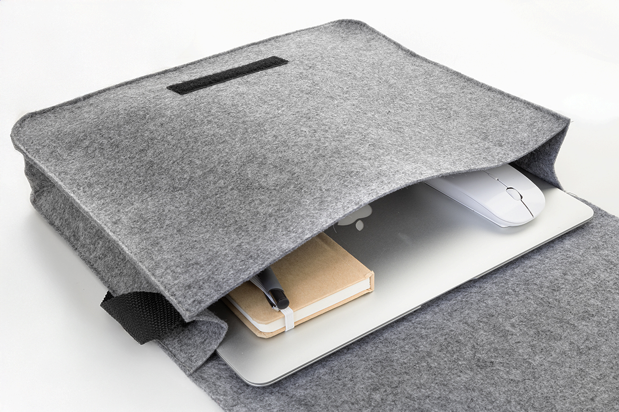 RPET plstěná brašna na notebook s nastavitelným ramenním popruhem. Vhodné pro notebooky do 15". S výrazným štítkem RPET.