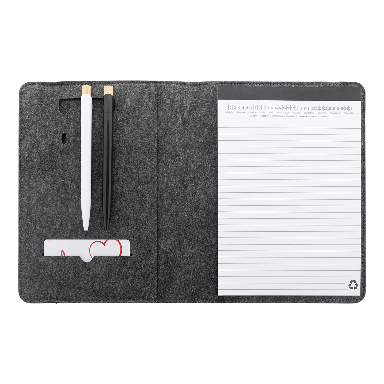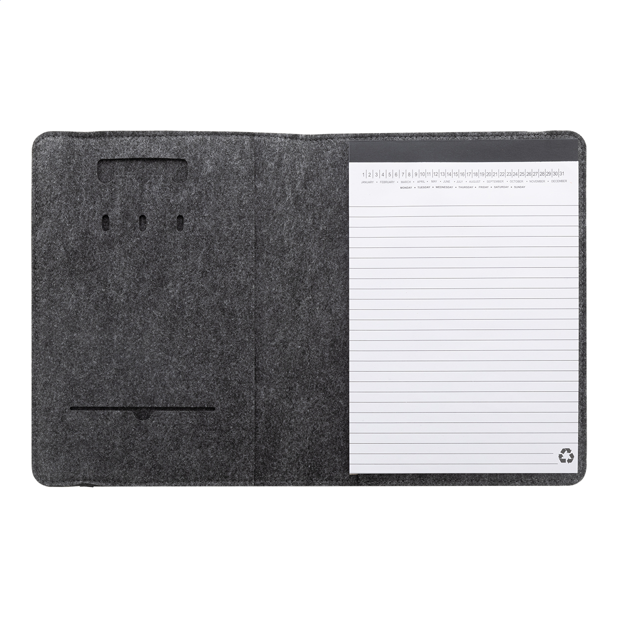 Tmavě šedá plstěná sloha ve velikosti A5 slouží jako diskrétní a funkční pomocník pro pracovní schůzky i osobní plánování. RPET materiál zaručuje dlouhou životnost a přispívá k ochraně životního prostředí bez kompromisů v designu.