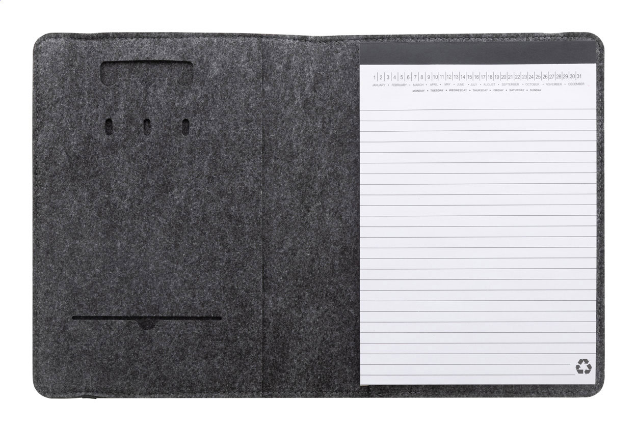 Plstěná sloha A5 na dokumenty z RPET formátu A5 s předními a několika vnitřními kapsami s organizérem. S 20 linkovanými listy poznámkového bloku z recyklovaného papíru.