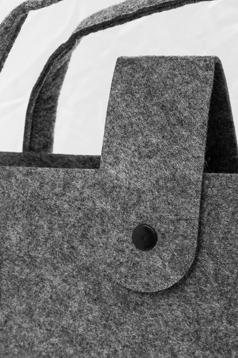 Nákupní taška z RPET plsti s klínkem, zapínáním na knoflíky a krátkými uchy. S výraznou etiketou z RPET.