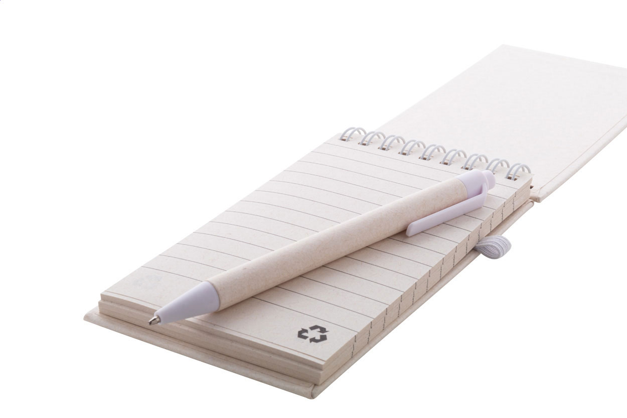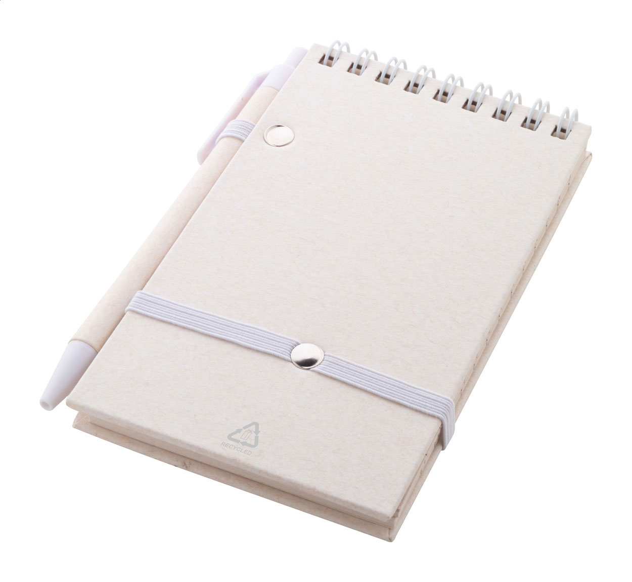 Spirálový blok A6 s deskami z recyklovaného z kartonu na mléko s pevnou vazbou a 70 linkovanými listy. Se spirálovými kroužky ve stejné barvě, gumičkou a poutkem na pero. Včetně recyklovaného kartonového papíru na mléko a recyklovaného ABS plastového kuličkového pera s modrou náplní.