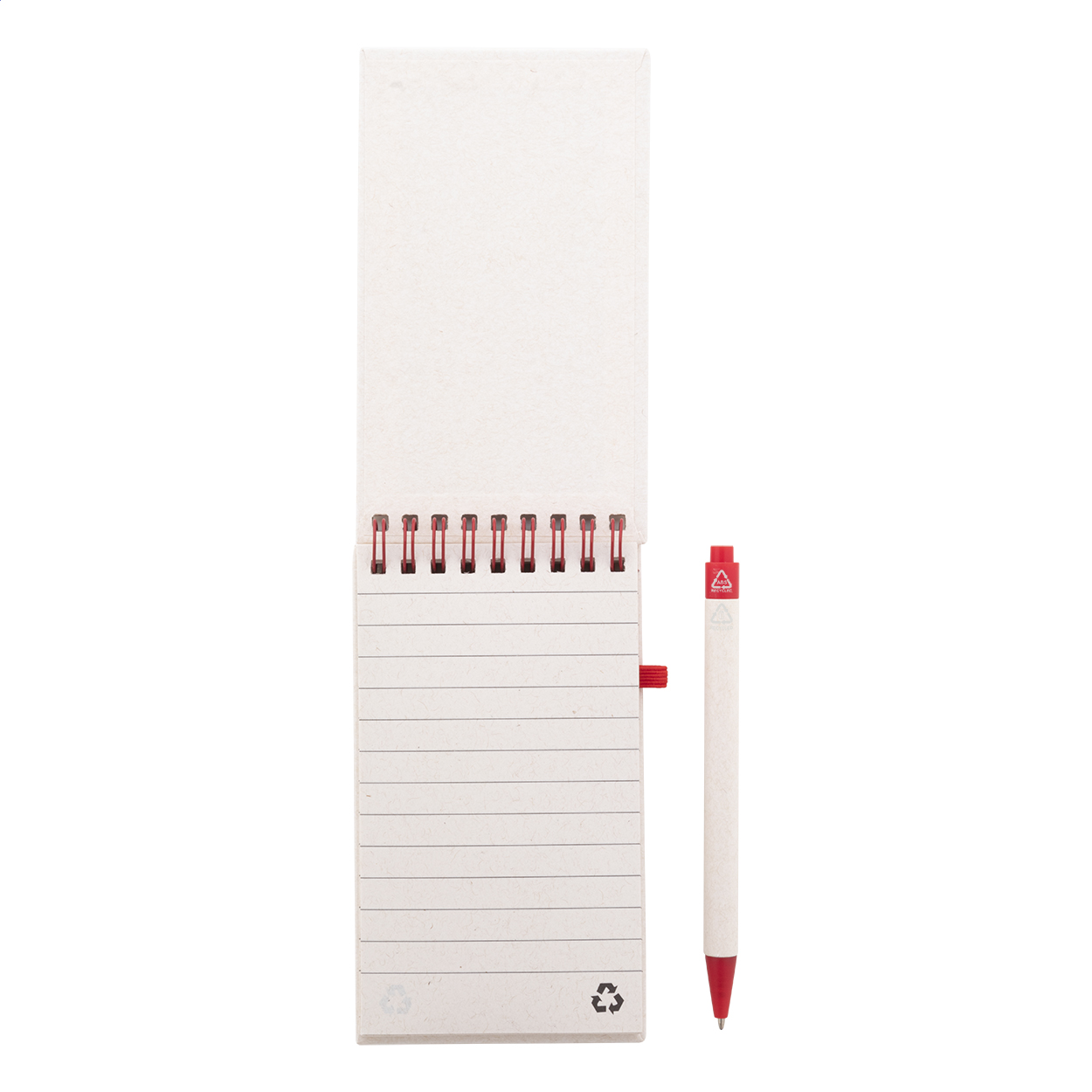 Spirálový blok A6 s deskami z recyklovaného z kartonu na mléko s pevnou vazbou a 70 linkovanými listy. Se spirálovými kroužky ve stejné barvě, gumičkou a poutkem na pero. Včetně recyklovaného kartonového papíru na mléko a recyklovaného ABS plastového kuličkového pera s modrou náplní.