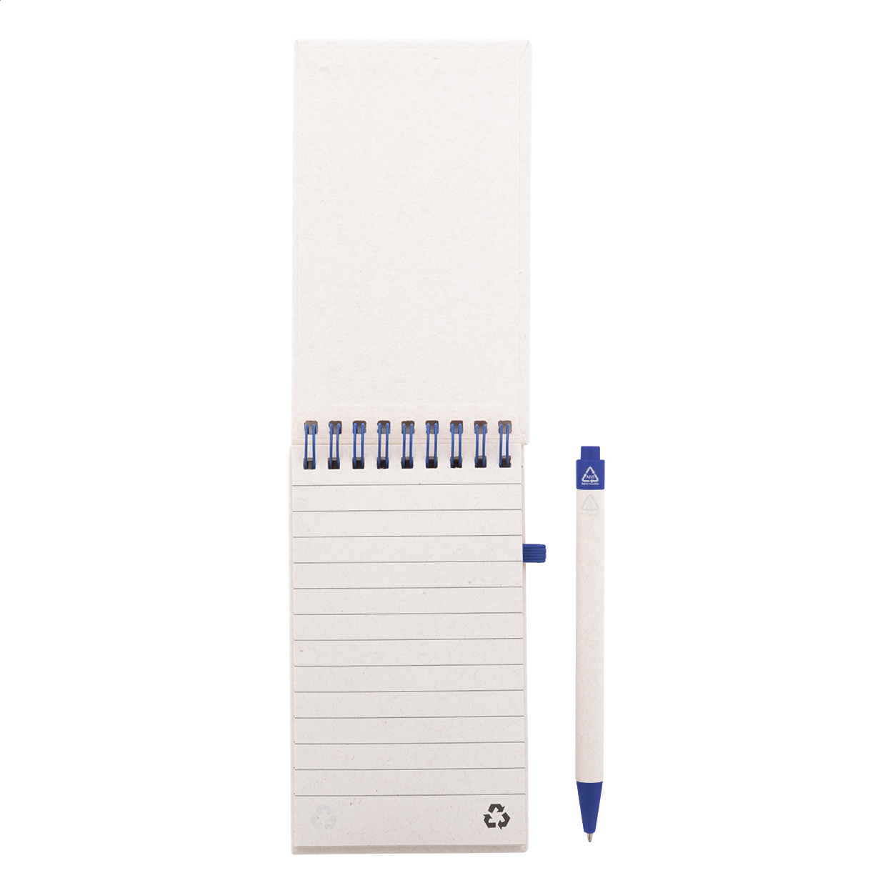 Spirálový blok A6 s deskami z recyklovaného z kartonu na mléko s pevnou vazbou a 70 linkovanými listy. Se spirálovými kroužky ve stejné barvě, gumičkou a poutkem na pero. Včetně recyklovaného kartonového papíru na mléko a recyklovaného ABS plastového kuličkového pera s modrou náplní.