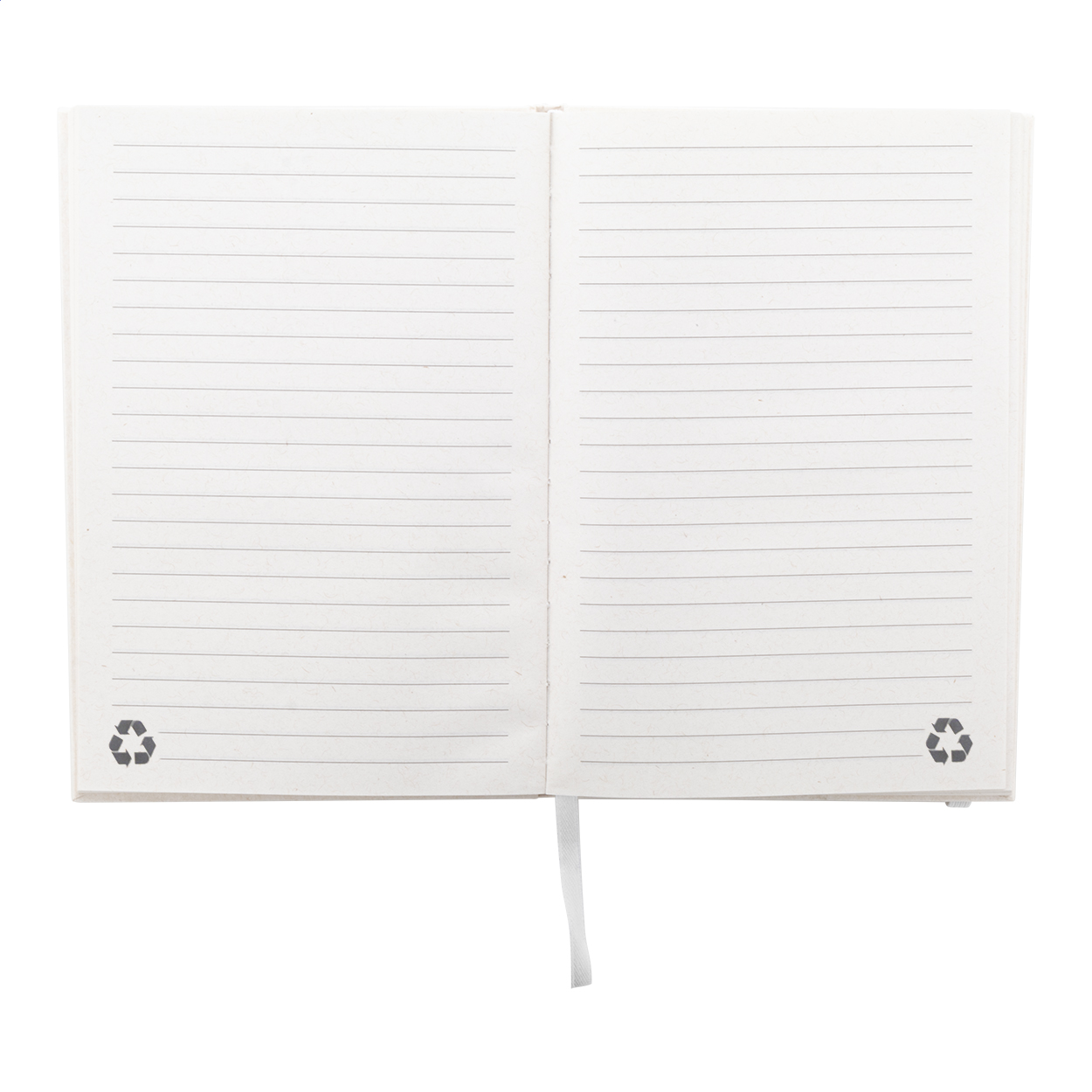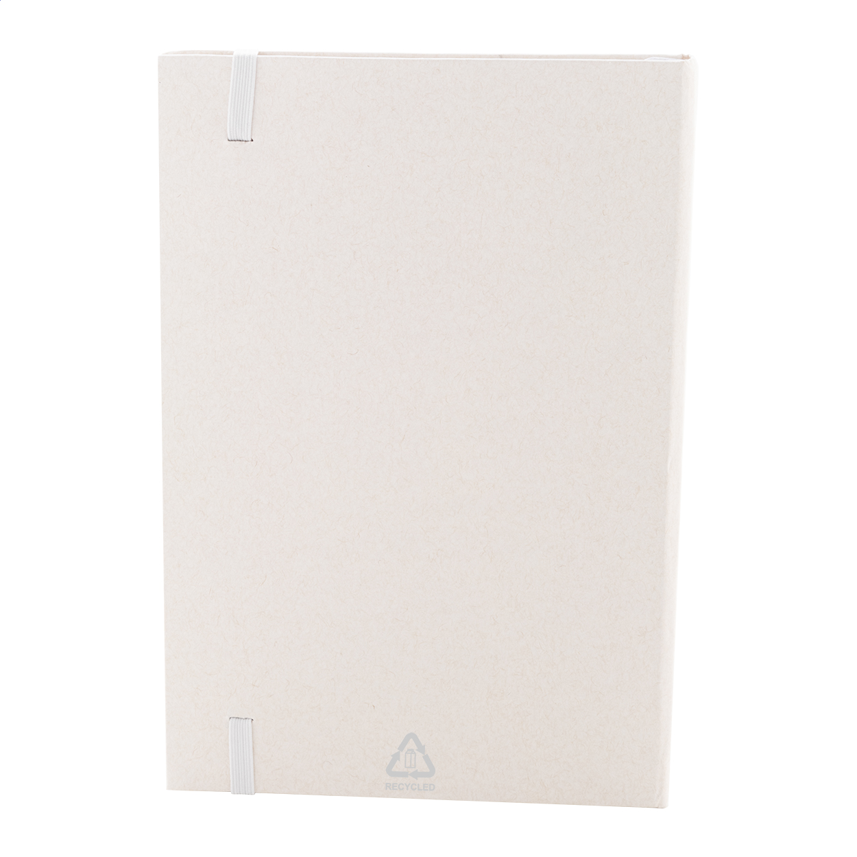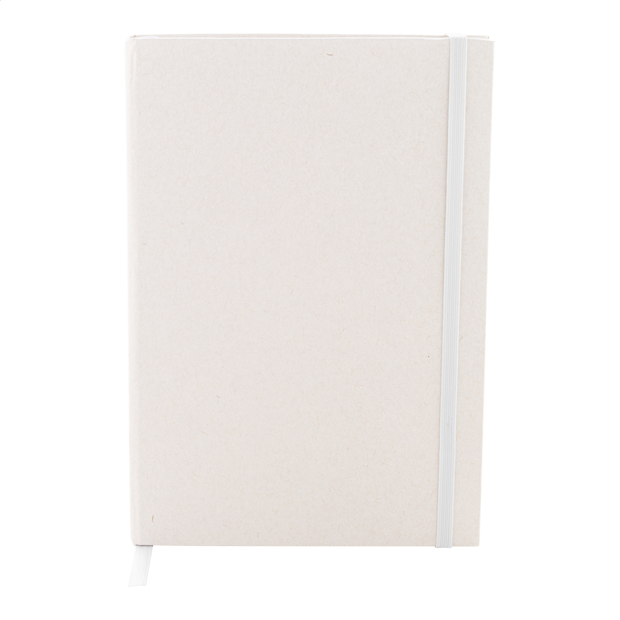 Blok A5 z kartonu z recyklovaného mléka s pevnou vazbou, 80 linkovanými listy a elastickým páskem v odpovídající barvě.