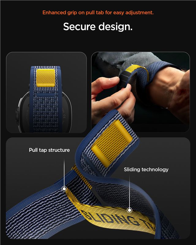 Nylonový pásek pro Samsung Galaxy Watch 8 ve velikostech 40 mm, 44 mm a 46 mm kombinuje sportovní funkčnost s moderním stylem. Prodyšná textilní struktura efektivně odvádí vlhkost od pokožky, což zvyšuje komfort při sportu i spánku. Tmavě modré provedení s kontrastním žlutým prošíváním dodává hodinkám unikátní vzhled.