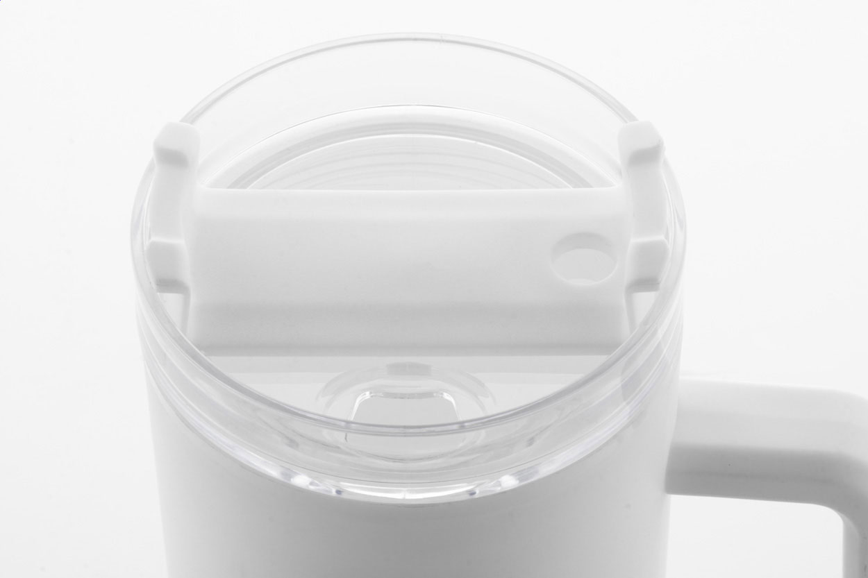 Dvoustěnný termo hrnek z recyklovaného PP plastu s plastovým víčkem na pití a brčkem. 900 ml.