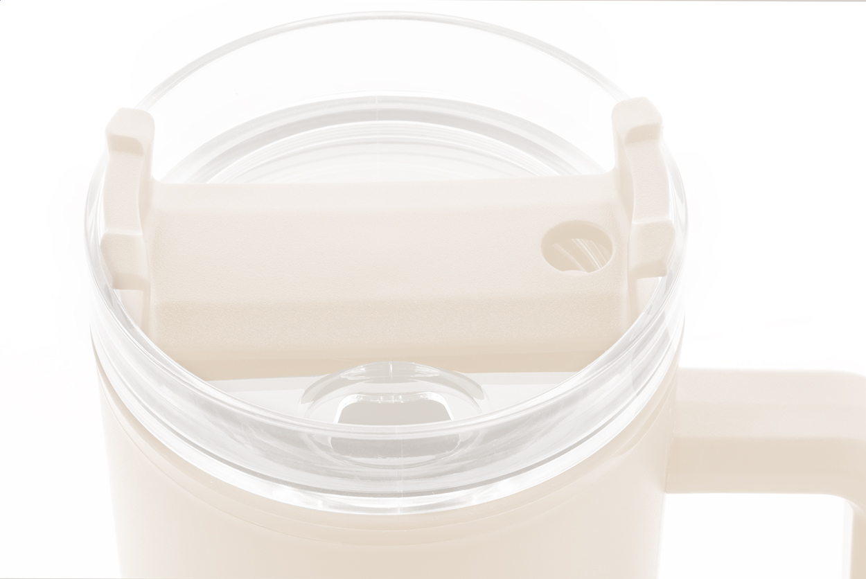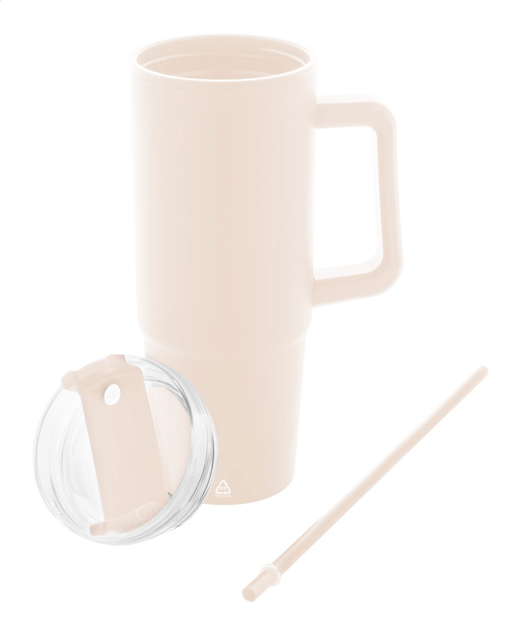 Dvoustěnný termo hrnek z recyklovaného PP plastu s plastovým víčkem na pití a brčkem. 900 ml.