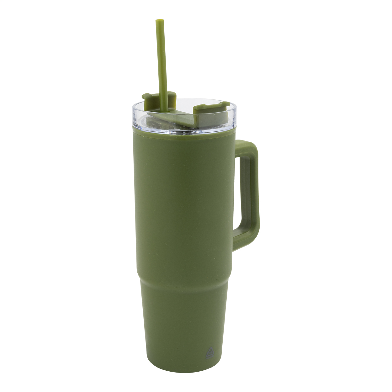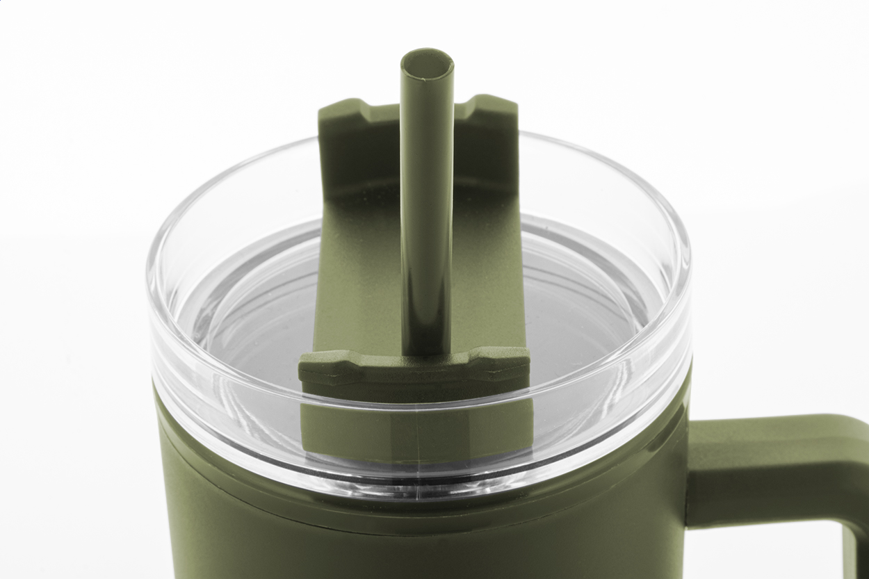Dvoustěnný termo hrnek z recyklovaného PP plastu s plastovým víčkem na pití a brčkem. 900 ml.