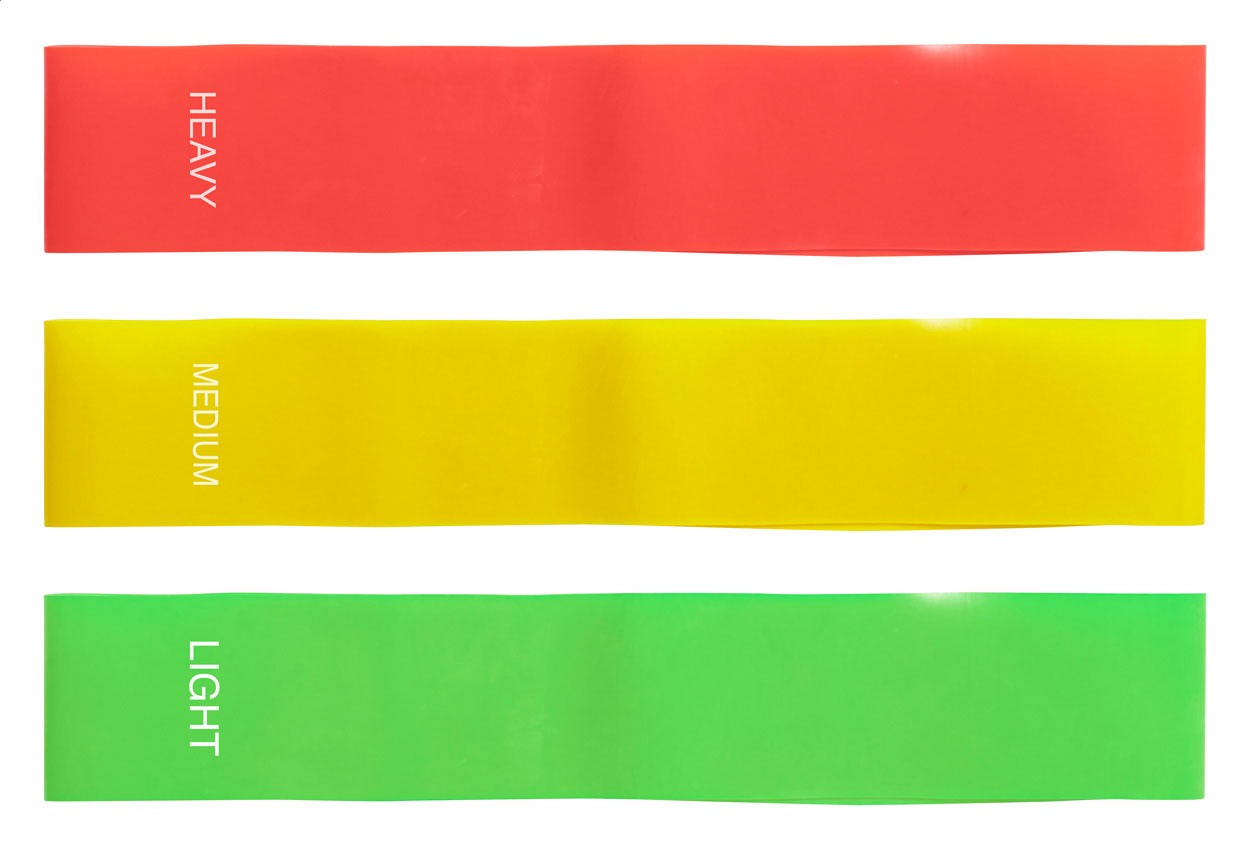 Sada 3 ks cvičebních gum s různým odporem (lehký, střední, těžký) z TPE. S transportním obalem se stahovací šňůrkou.