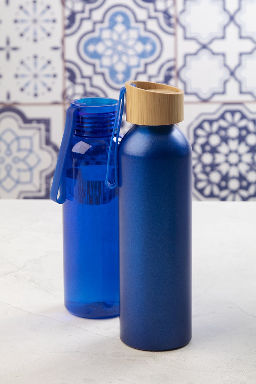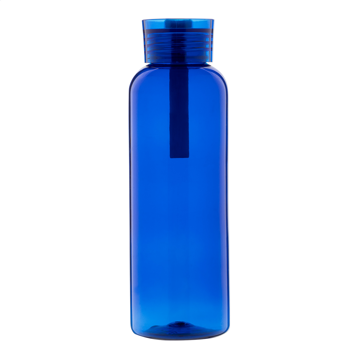 Láhev RPET s víčkem v odpovídající barvě a silikonovým popruhem, 500 ml. Nevhodné pro sycené nápoje.