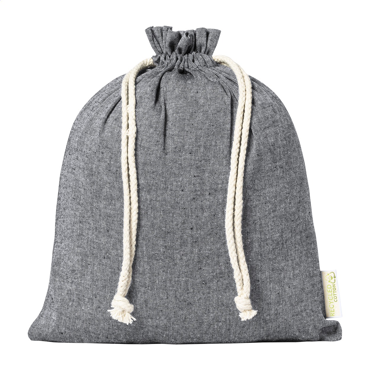 Opakovaně použitelný pytlík na potraviny vyrobený z recyklované bavlny se zavíráním na stahovací šňůrku. 100% recyklovaná bavlna, 120 g/m2.