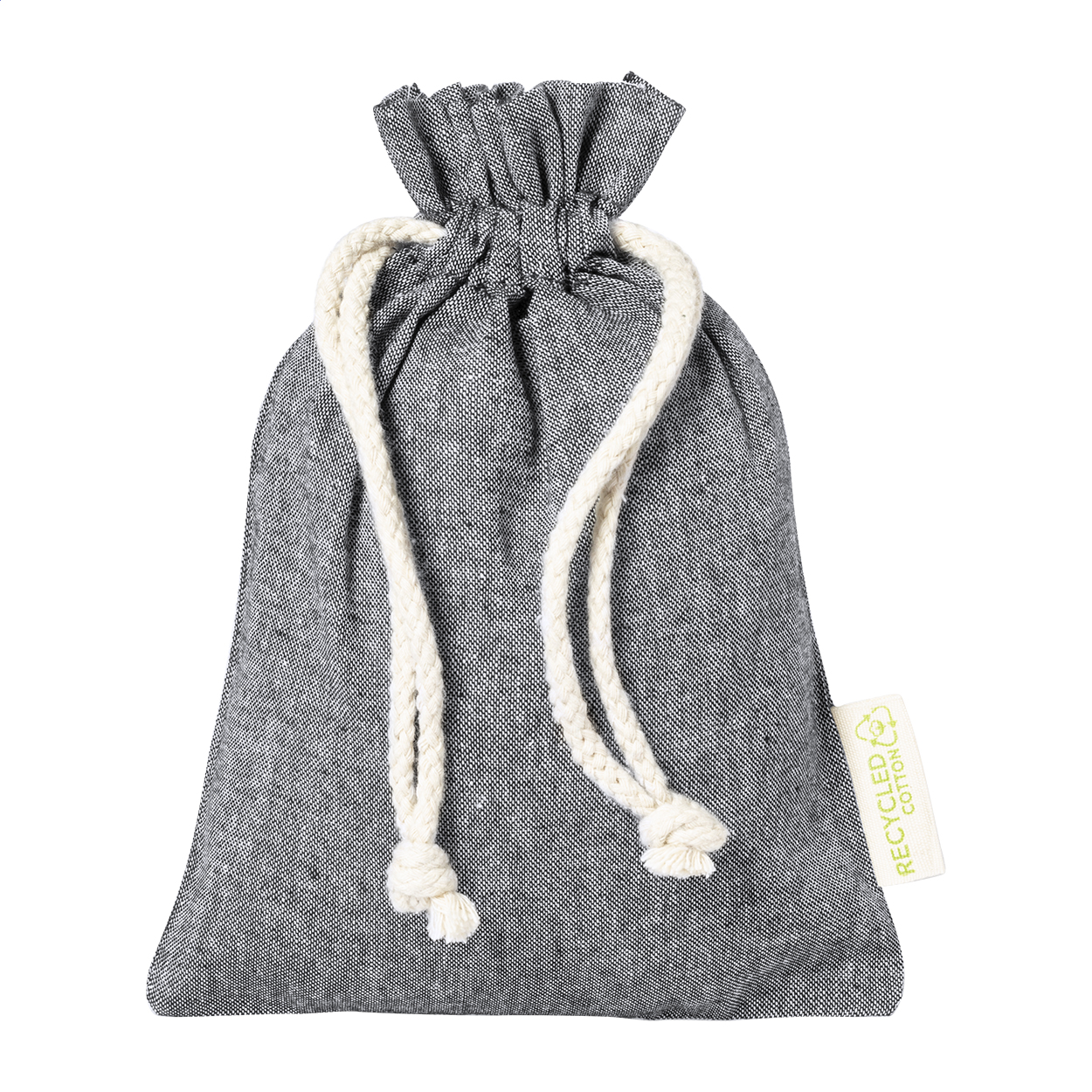 Opakovaně použitelný pytlík na potraviny vyrobený z recyklované bavlny. Zavírání se stahovací šňůrkou. 100% recyklovaná bavlna, 120 g/m2. Rozměr produktu je 150×210 mm.