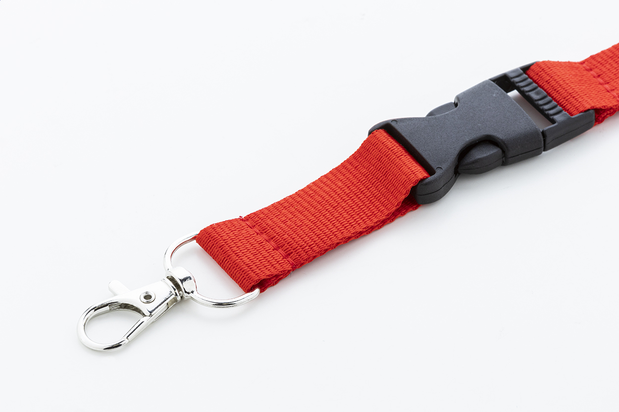 Polyesterový lanyard RPET s odnímatelnou kovovou karabinou a bezpečnostní přezkou.