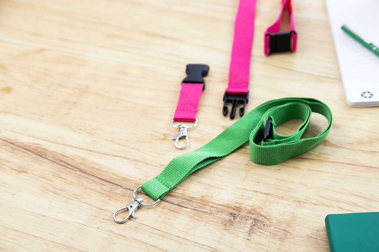 RPET polyesterový lanyard s kovovou karabinou a bezpečnostní přezkou.