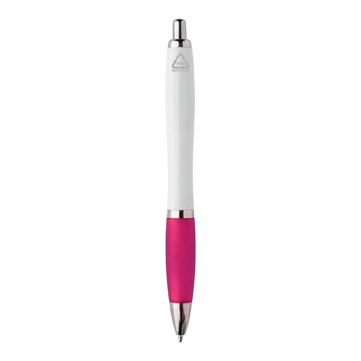 Kuličkové pero z recyklovaného ABS plastu s bílým tělem, barevným úchopem a chromovanými částmi. S modrou náplní.