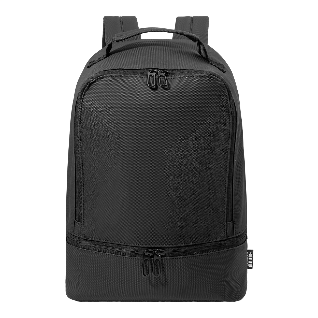 Voděodolný batoh z RPET s hlavní přihrádkou na zip, polstrovanou přihrádkou na notebook (13"), spodní přihrádkou na zip a skrytou boční kapsou. S polstrovanými zády a ramenními popruhy. Polyester 600D RPET s PU zátěrem a výrazným štítkem RPET.
