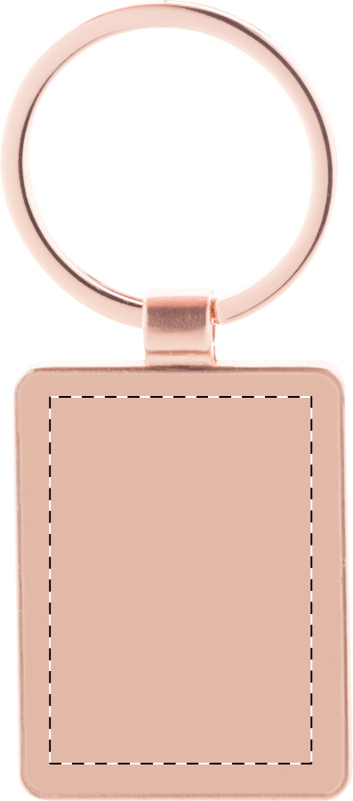 Kovový přívěsek na klíče obdélníkového tvaru ve zlatém provedení s bronzovým plátem. V kraftové papírové krabici.