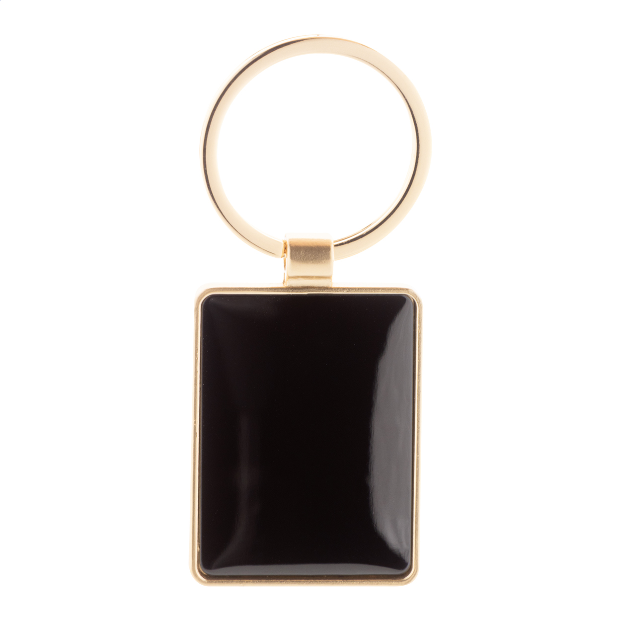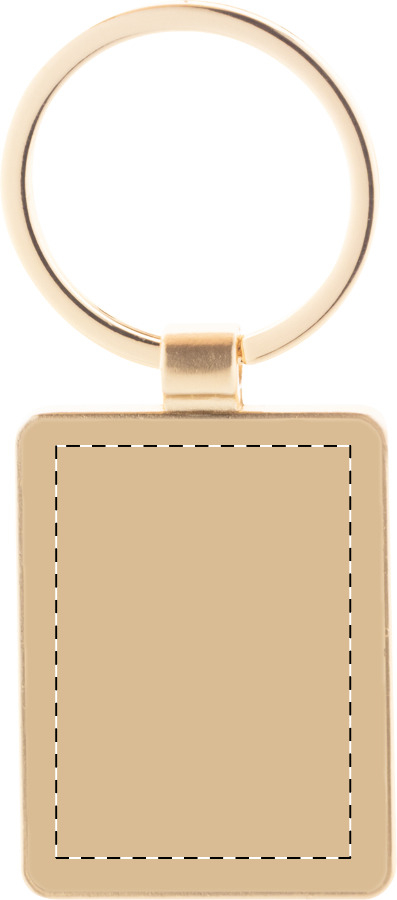 Kovový přívěsek na klíče obdélníkového tvaru ve zlatém provedení s bronzovým plátem. V kraftové papírové krabici.