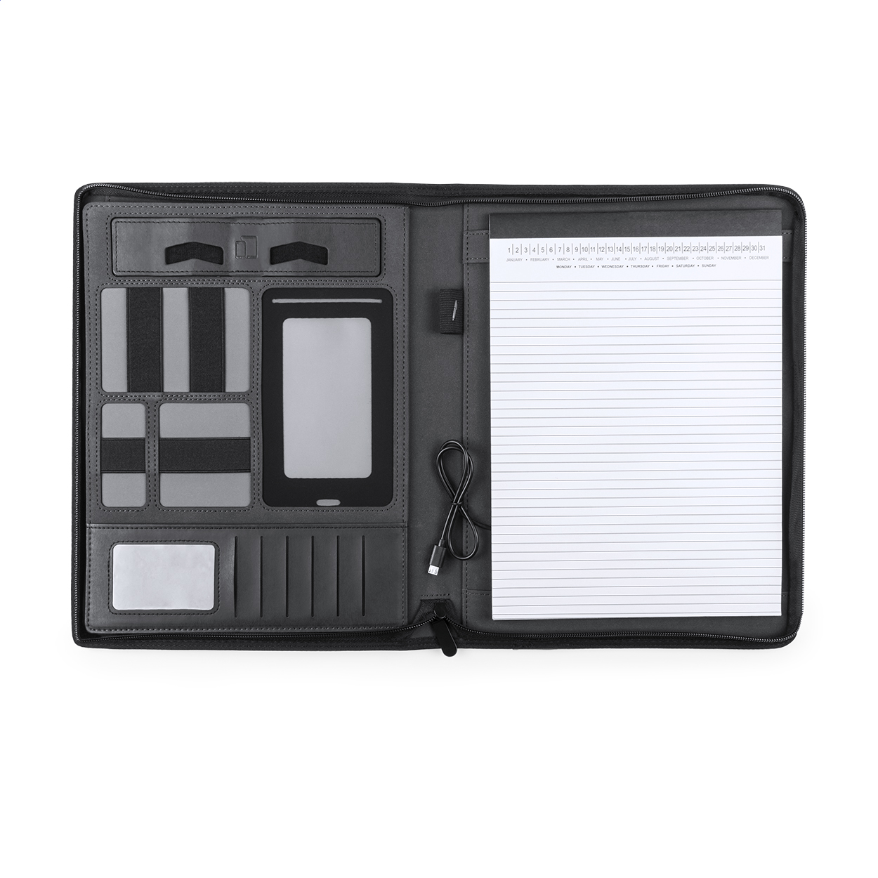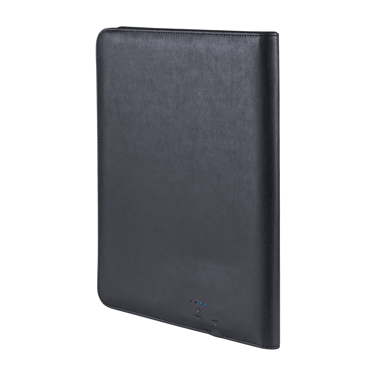 Konferenční desky z PU kůže se zabudovanou powerbankou s kapacitou 5000 mAh. Uvnitř desek také najdete linkovaný blok s 20 listy a stojánek na tablet. Včetně nabíjecího USB kabelu.