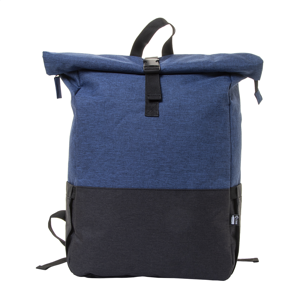 Dvoubarevný rolovací batoh z RPET se zapínáním na přezku, hlavní přihrádka na zip, polstrovaná přihrádka na notebook (15") a tablet (10"), boční kapsy, polstrovaná záda a ramenní popruhy. 300D RPET polyester s výrazným štítkem RPET.