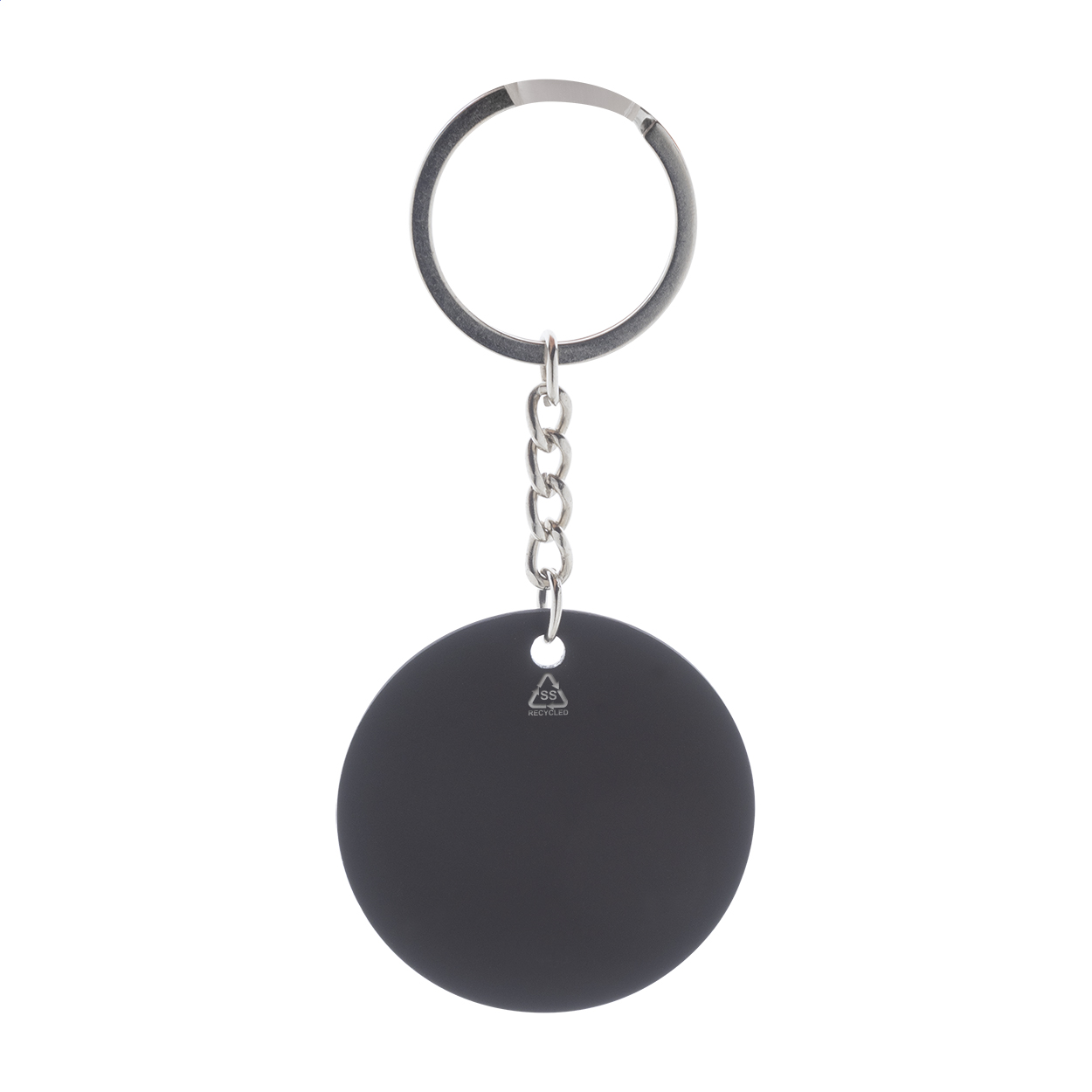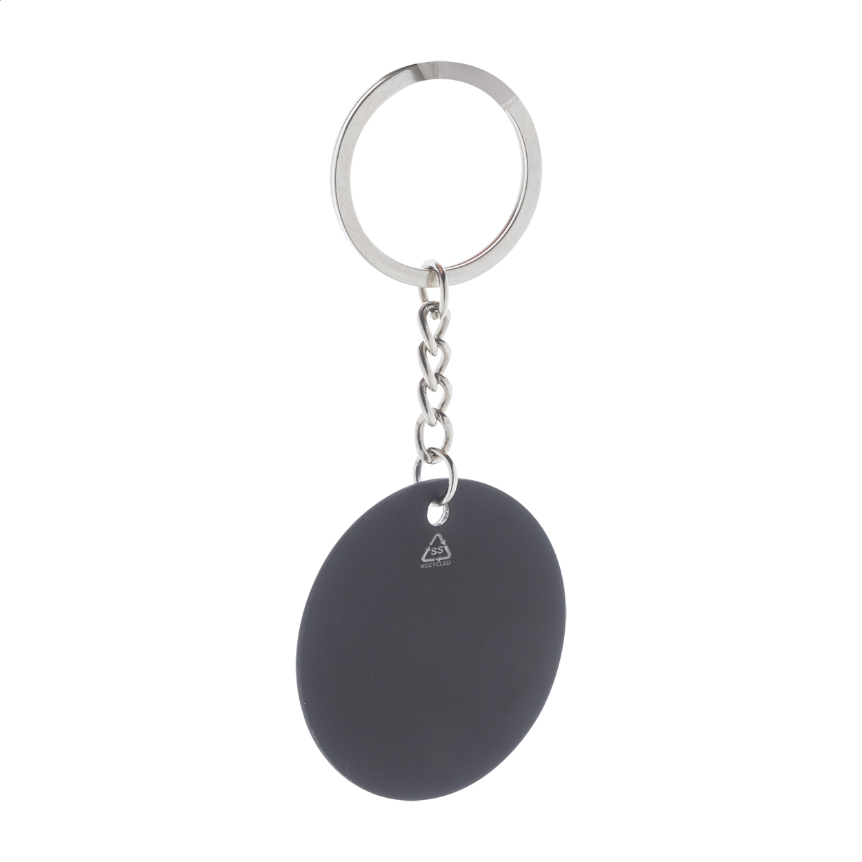 Kulatý přívěsek na klíče z recyklované nerezové oceli s pogumovaným povrchem. Se speciální vrstvou pro zrcadlové laserové gravírování.