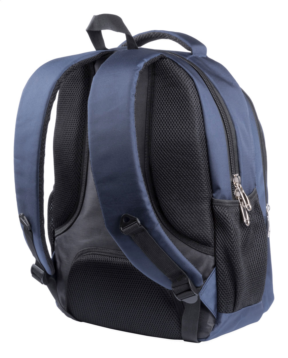 Batoh s mnoha přihrádkami na zip, polstrovanou kapsou na laptop (až 15 palců), zády a popruhy. Materiál 600D nylon.