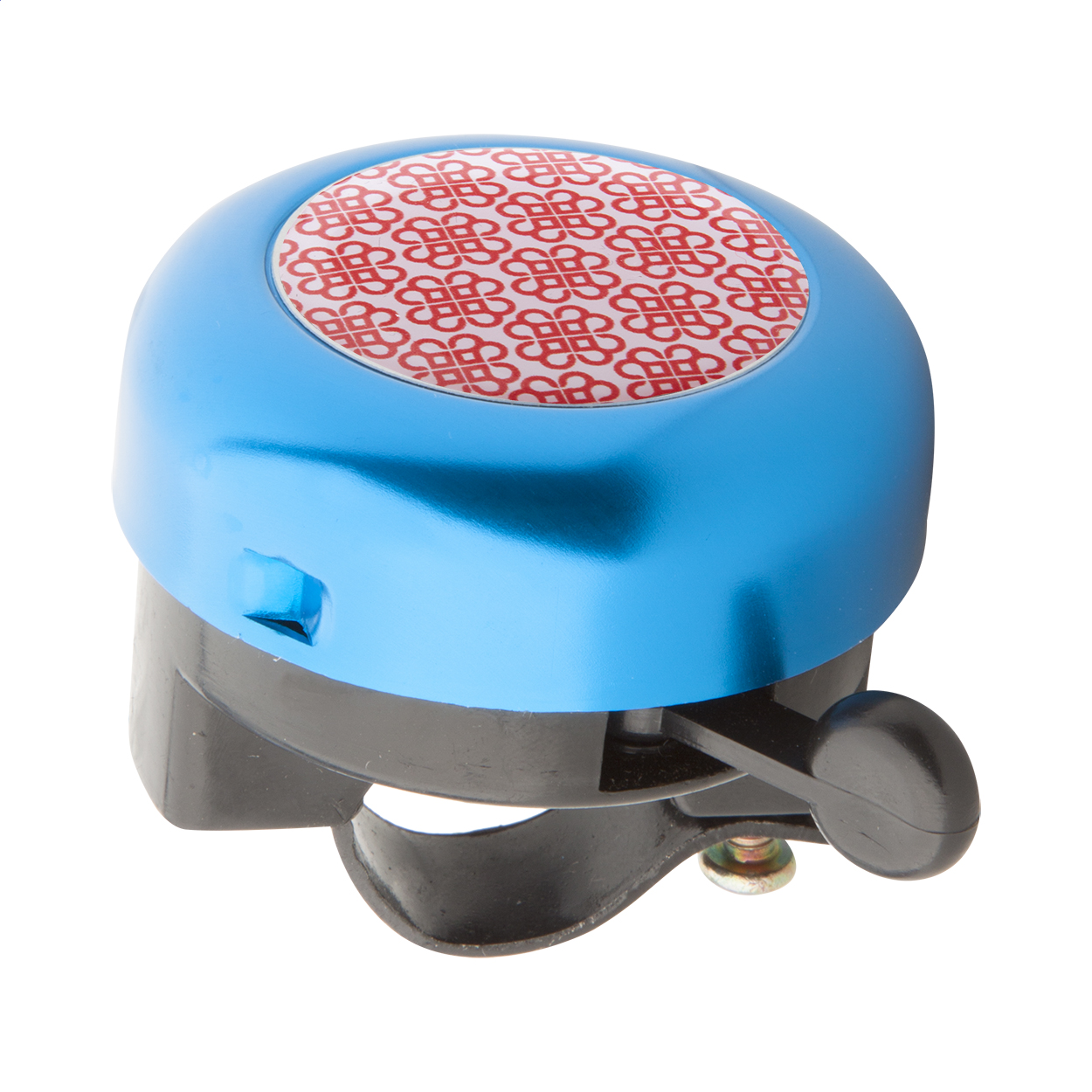 Hliníkový zvonek na kolo se stříbrnou plochou.
