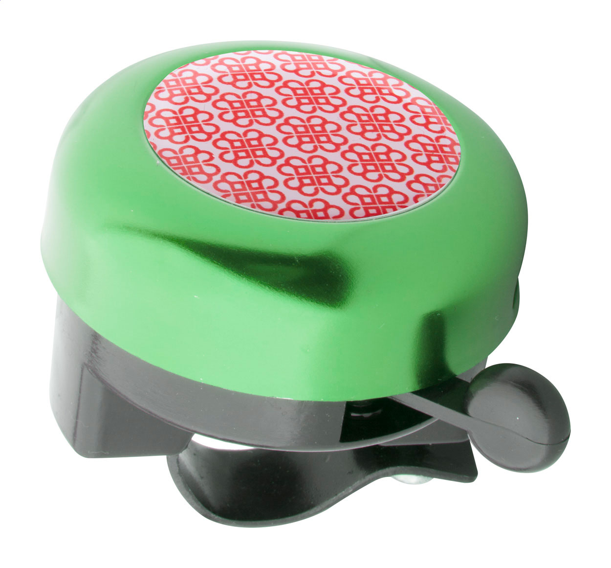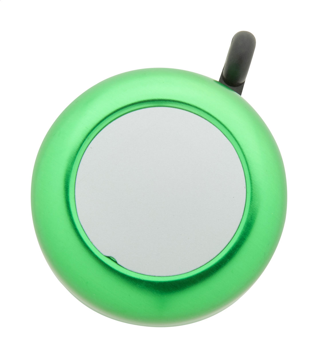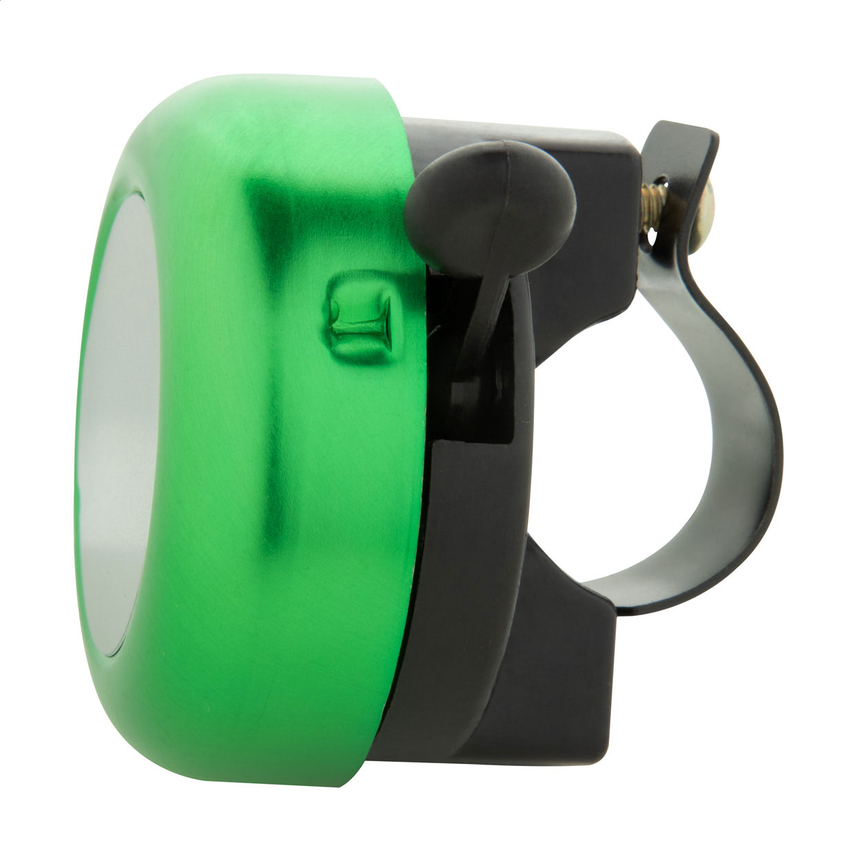 Hliníkový zvonek na kolo se stříbrnou plochou.
