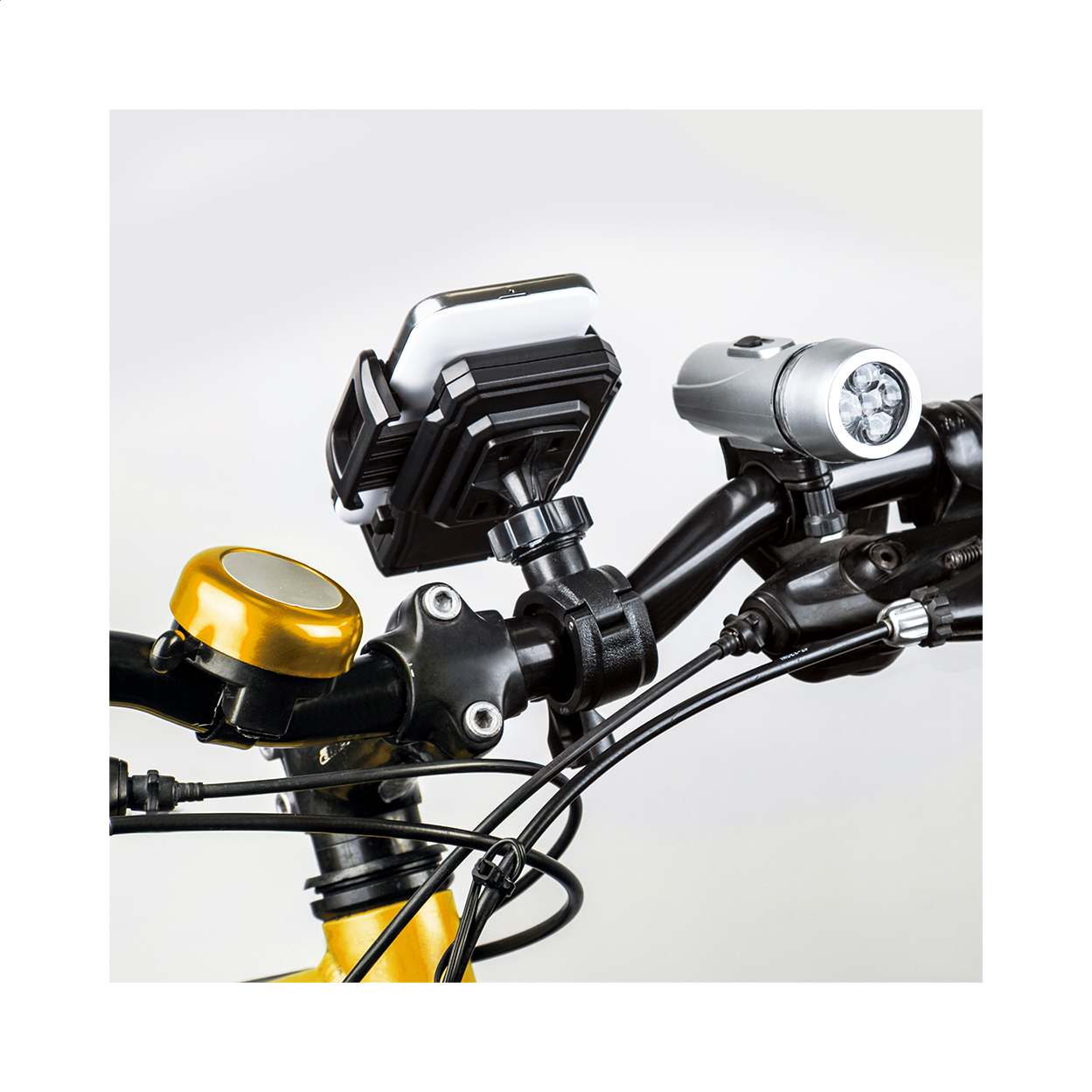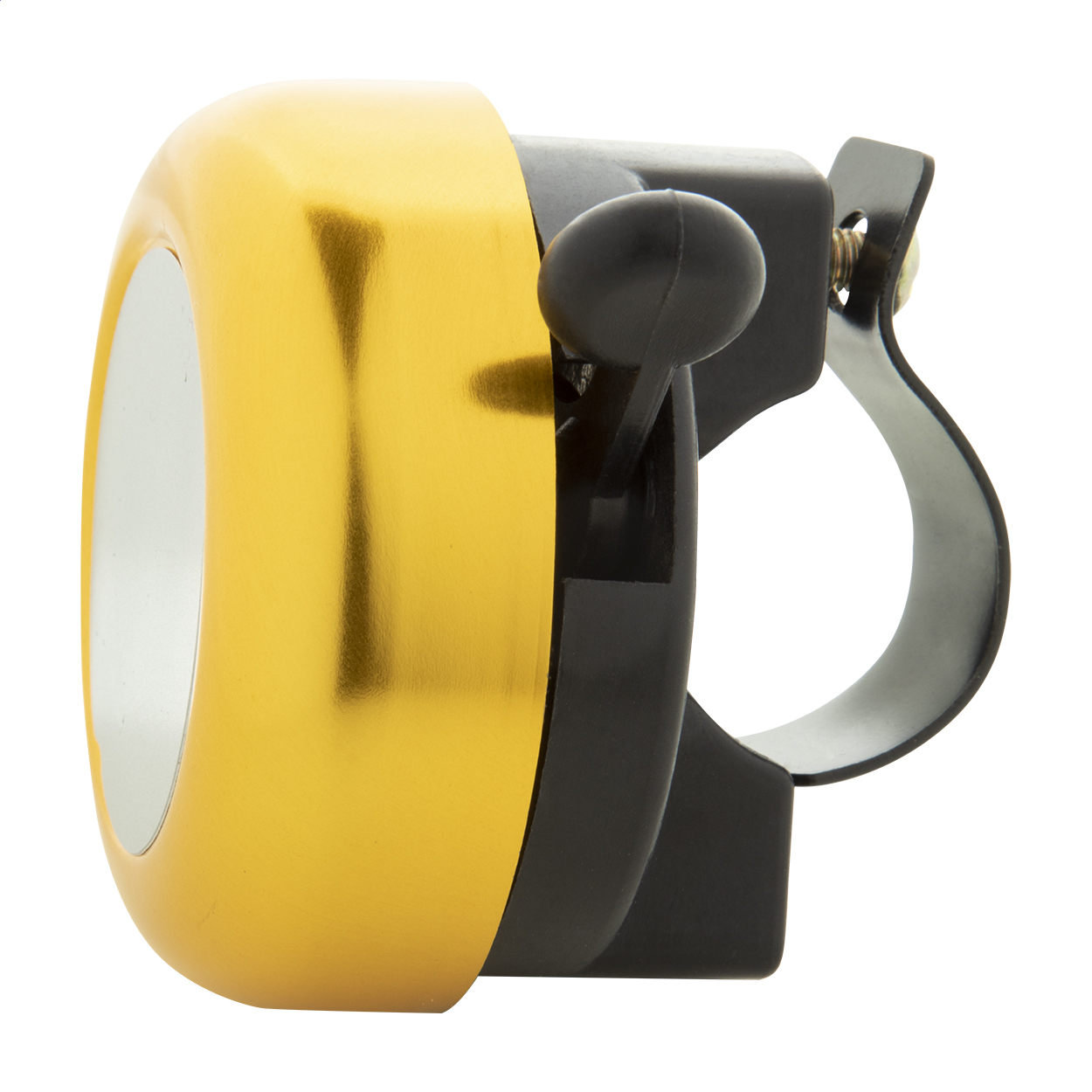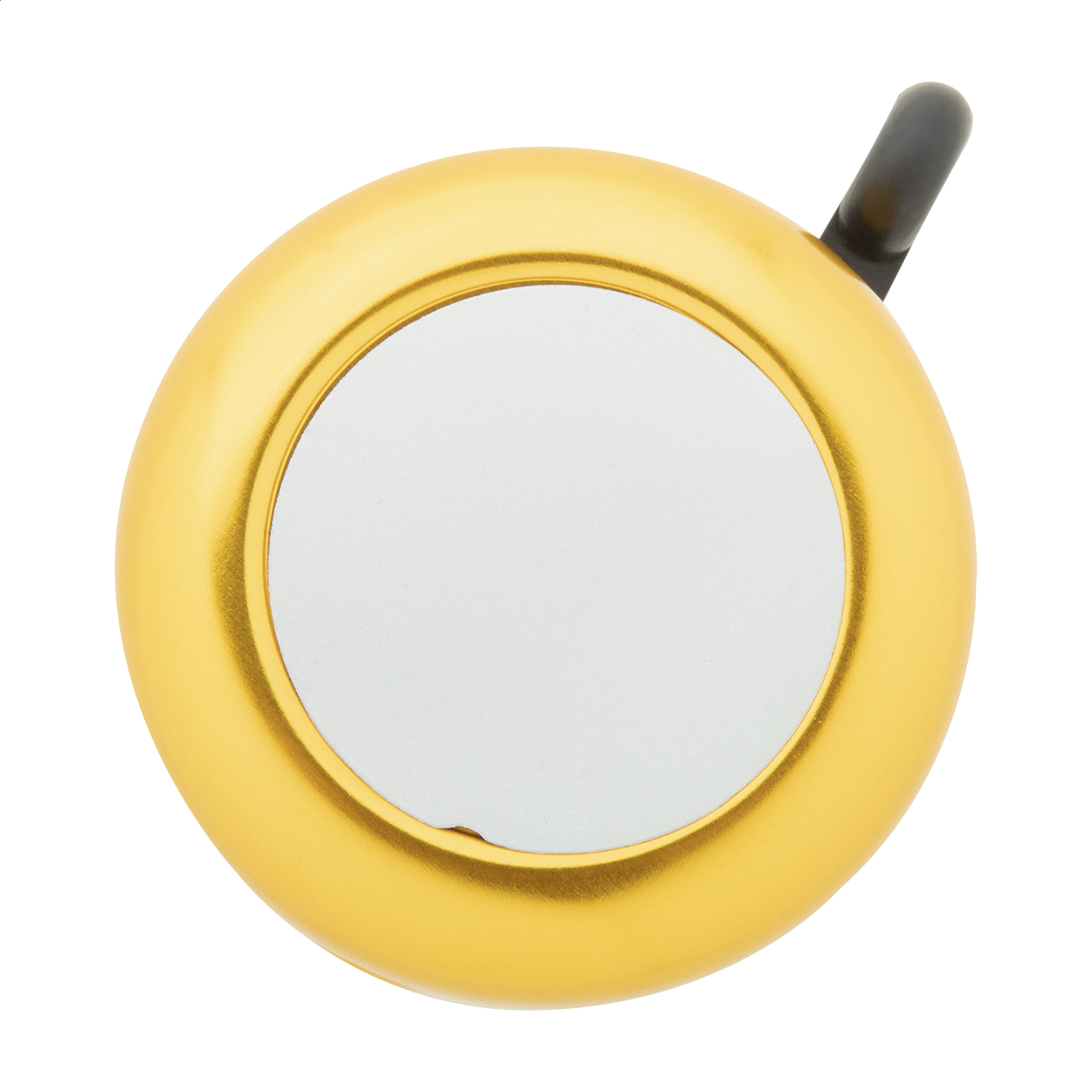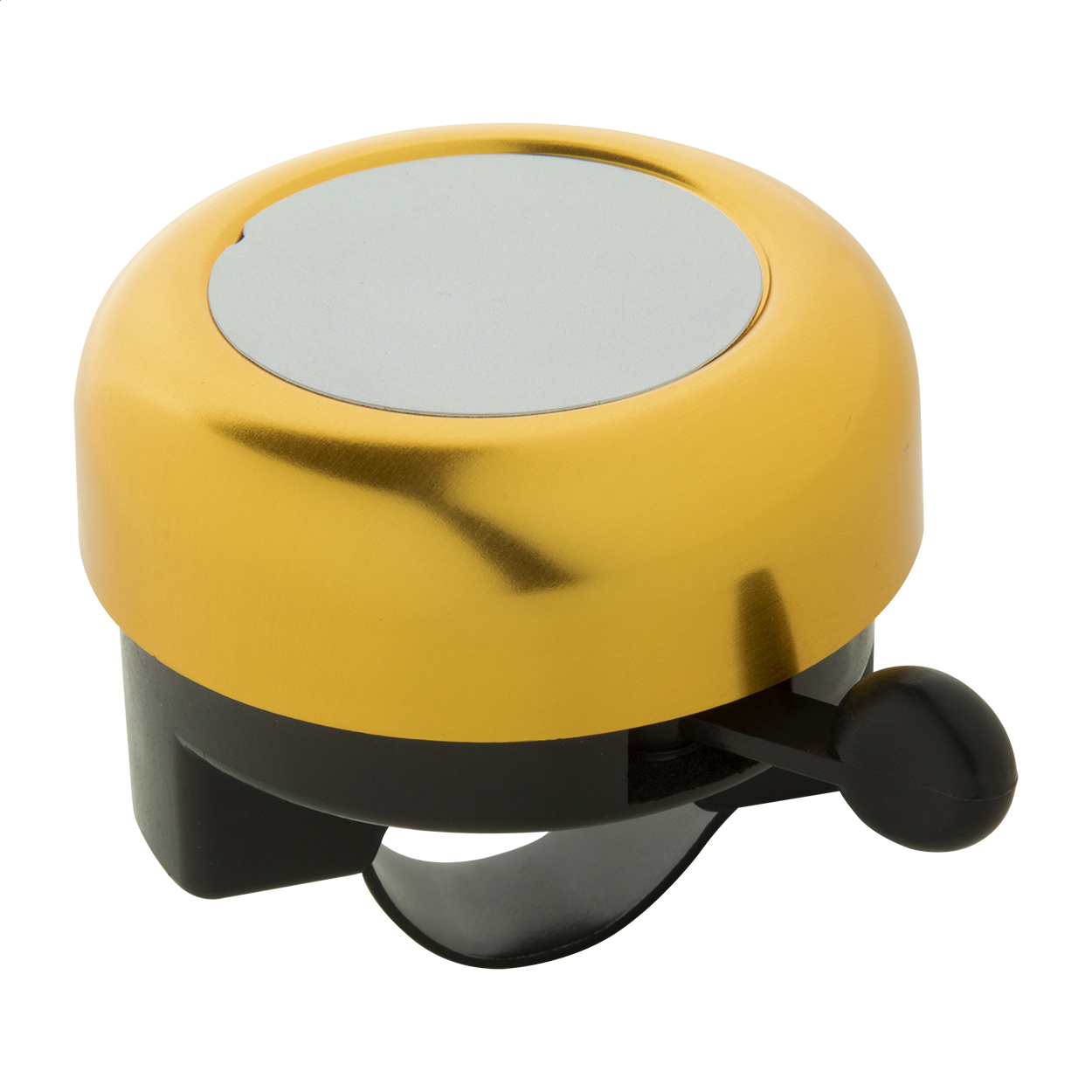 Hliníkový zvonek na kolo se stříbrnou plochou.