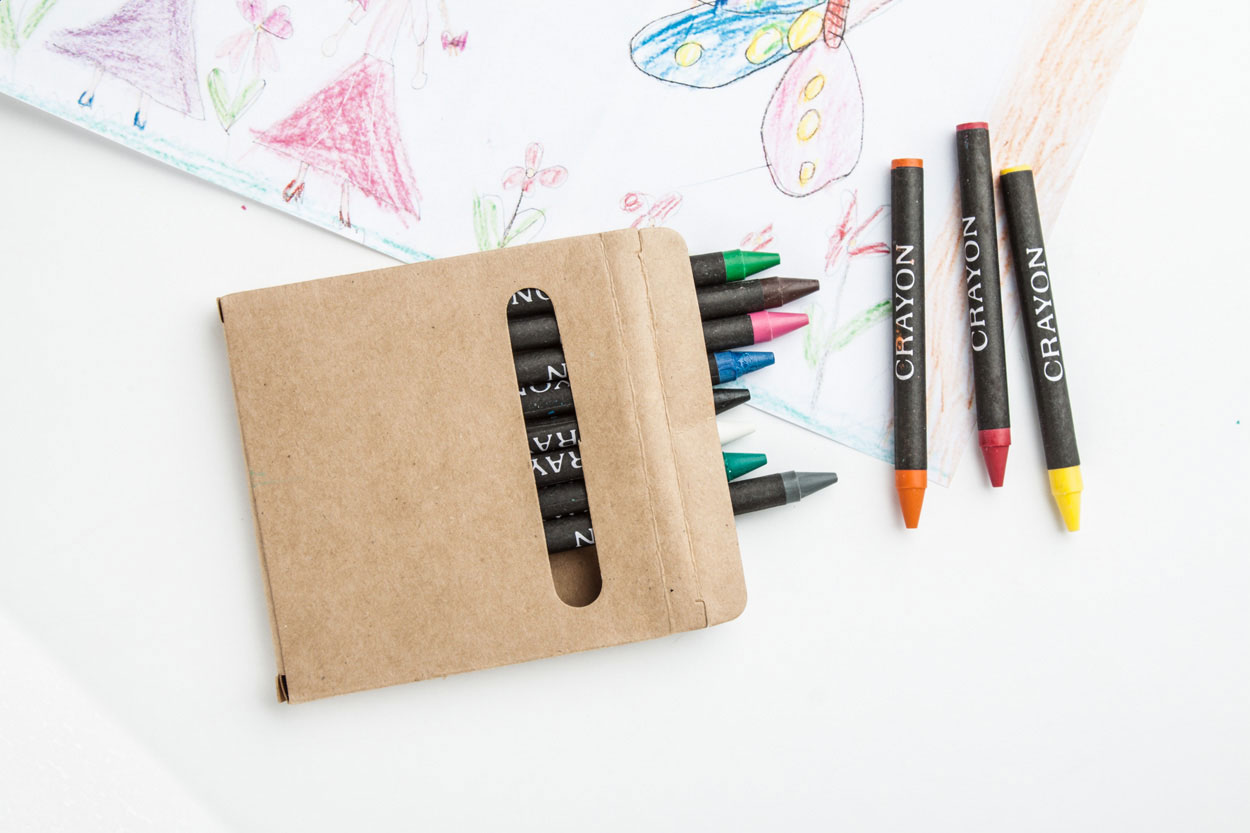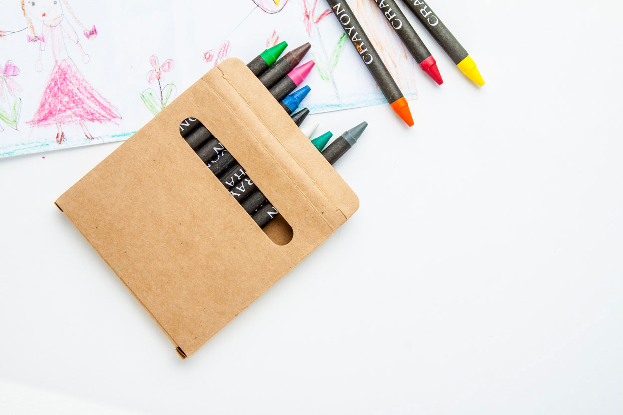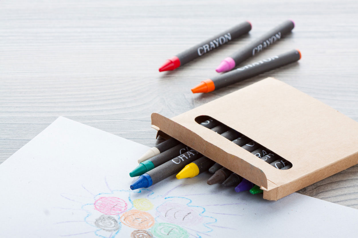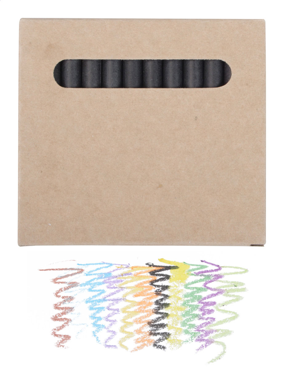 Barevné voskovky obalené černým papírem dodávané v papírové krabičce. 12 kusů.