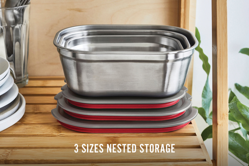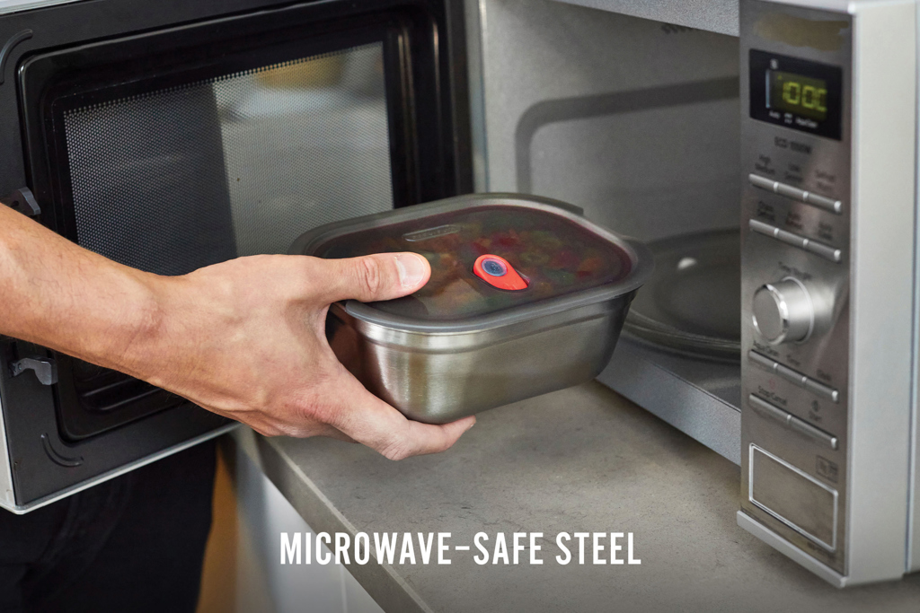 Tato sada tří mikrovlnce vhodných nerezových krabiček je určena pro každodenní použití – lehké, odolné a vzduchotěsné. Jsou ideální na snídani, oběd, svačiny, skladování jídla i jídla z trouby přímo na stůl. Každá krabička má mikrovlnce bezpečnou ocelovou konstrukci a vakuově uzavřené, nepropustné víko pro delší čerstvost. Poloprůhledné víko umožňuje rychlý přehled, nerezová základna je vhodná do myčky, mrazáku i trouby (víko do trouby ne). Odnímatelné těsnění usnadňuje čištění. Větrací ventil na víku umožňuje ohřev v mikrovlnce bez sundání víka, zkracuje ohřev a zabraňuje postříkání. Krabičky lze zasunout pro úsporu místa nebo stohovat. Jsou bez BPA a nabízejí chytré řešení pro každé jídlo.