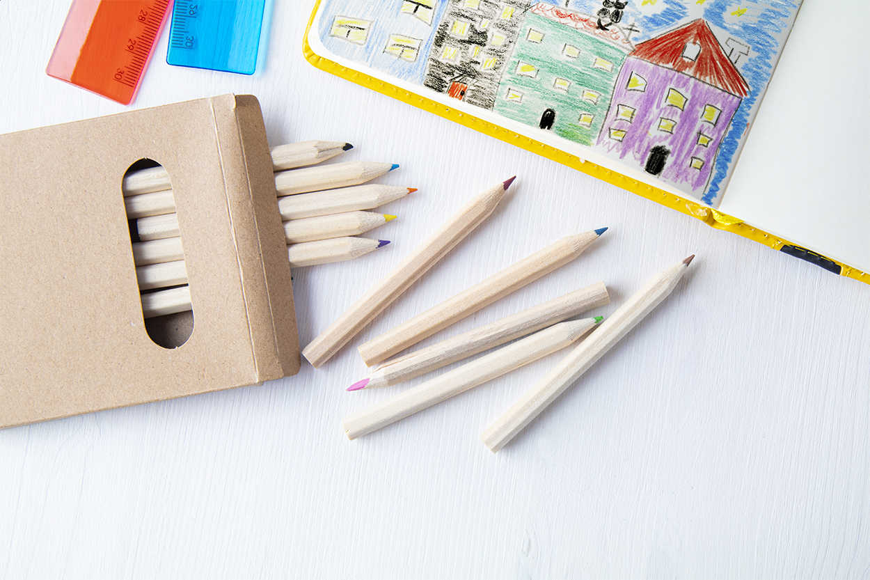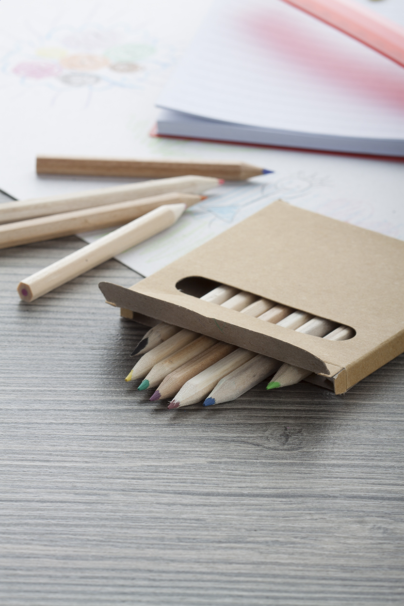 12 dřevěných pastelek v papírové krabičce.