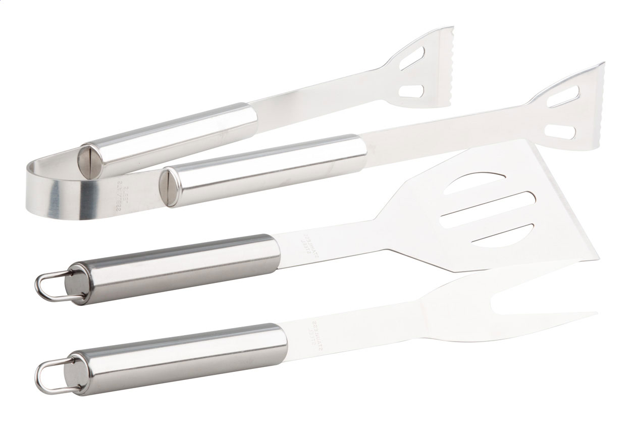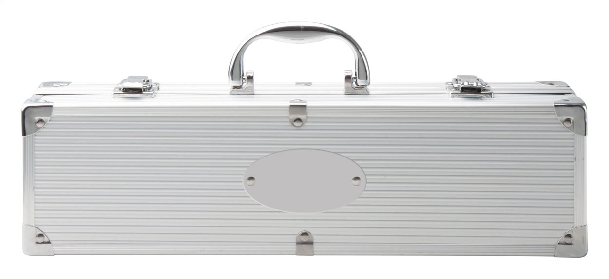 BBQ set na grilování obsahující vidličku, obracečku a kleště. Baleno v praktickém hliníkovém kufříku.