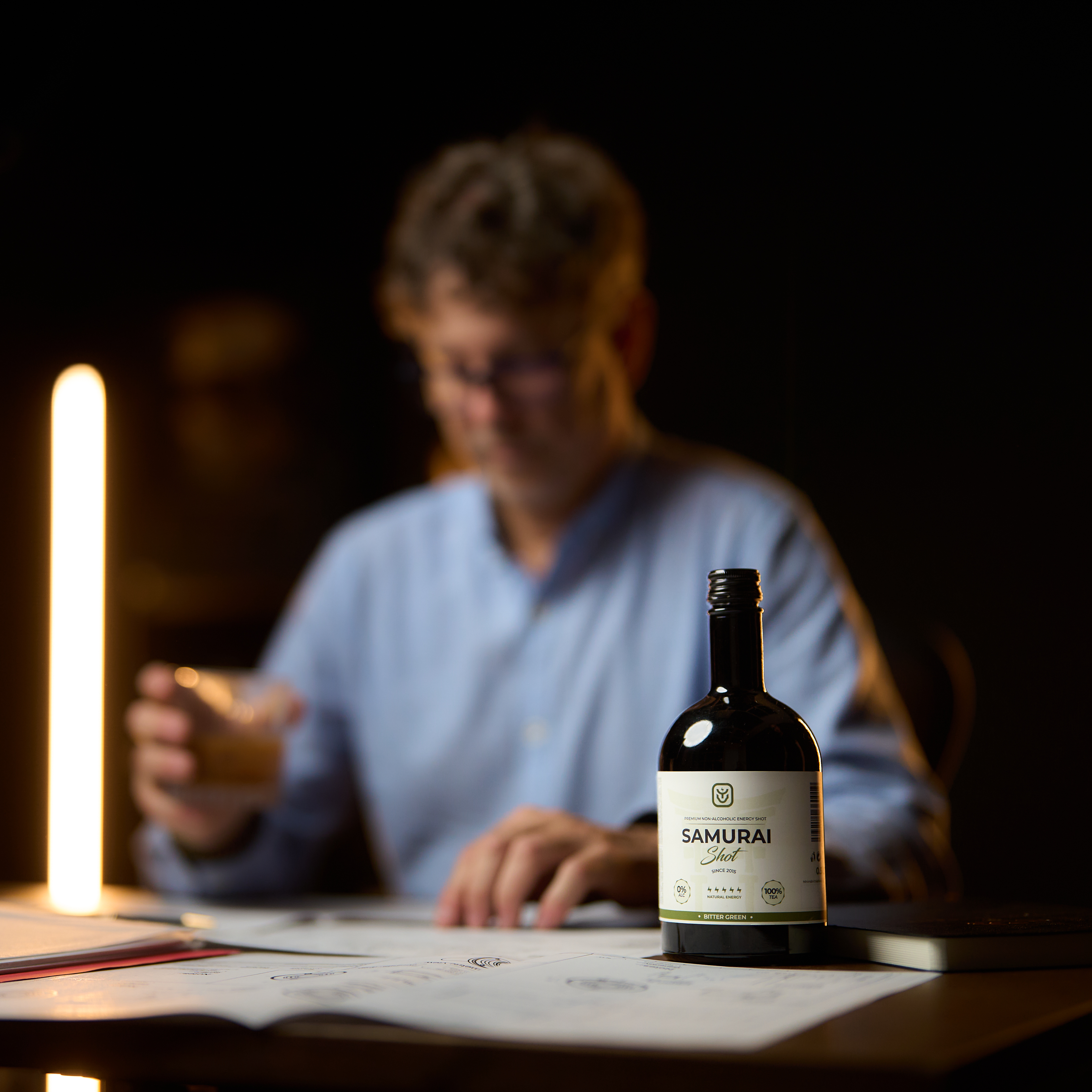 Lokální výroba s odpovědností: Samurai Shot - Bitter Green je vyráběn kompletně v České republice. Každý krok od přípravy až po plnění je řízen lokálně, s cílem zajistit kvalitu, čerstvost a transparentnost výroby.