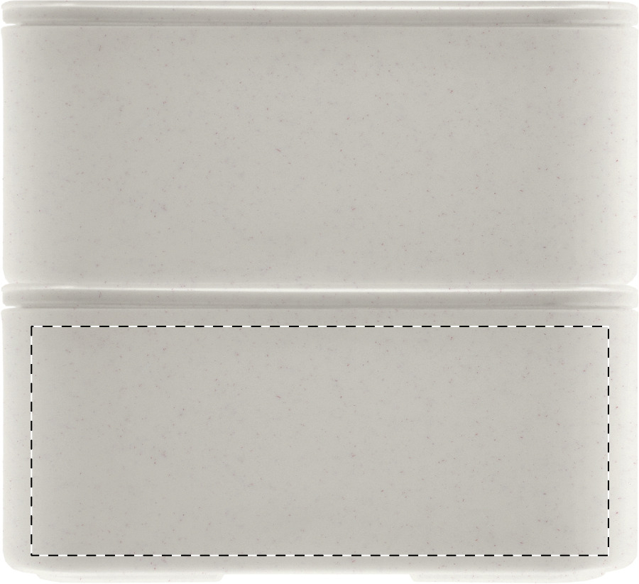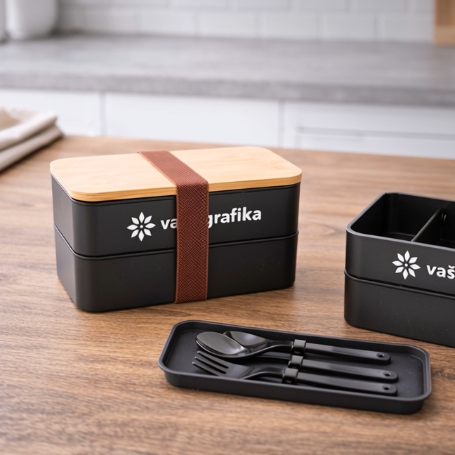 Skládá se ze dvou oddělených přihrádek o celkovém objemu 700 ml a pod víkem ukrývá kompletní sadu příboru v podobě vidličky, lžíce a nože.
