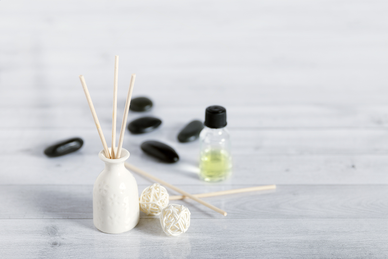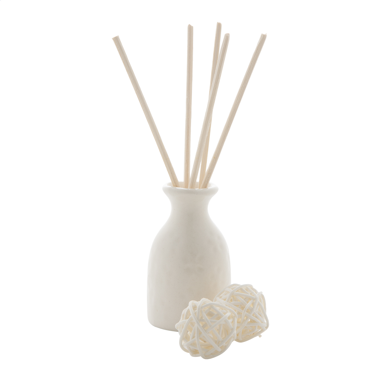 Set pro osvěžení vzduchu obsahující jasmínový olej, mini vázu z keramiky, 5 dřevěných tyčinek a 2 dřevěné kuličky. V dárkové krabičce.