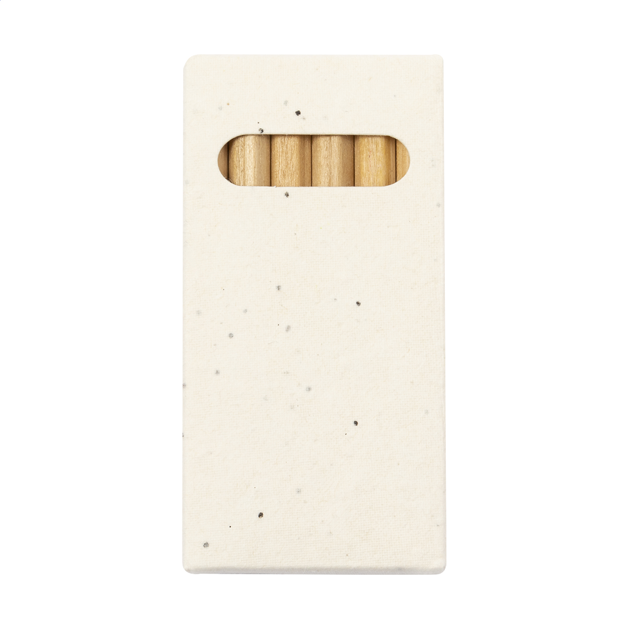 6dílná sada dřevěných barevných tužek v krabičce ze semenného papíru. Papírová krabička obsahuje semena petúnie v různých barvách, která lze po použití zasadit.