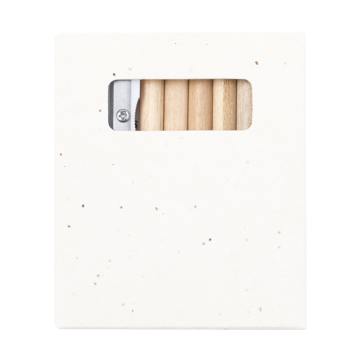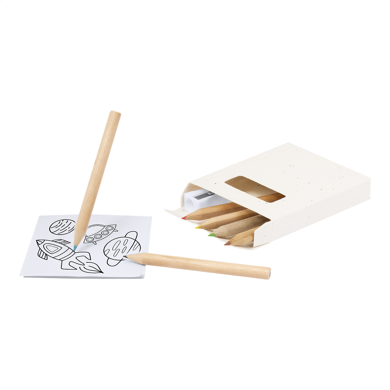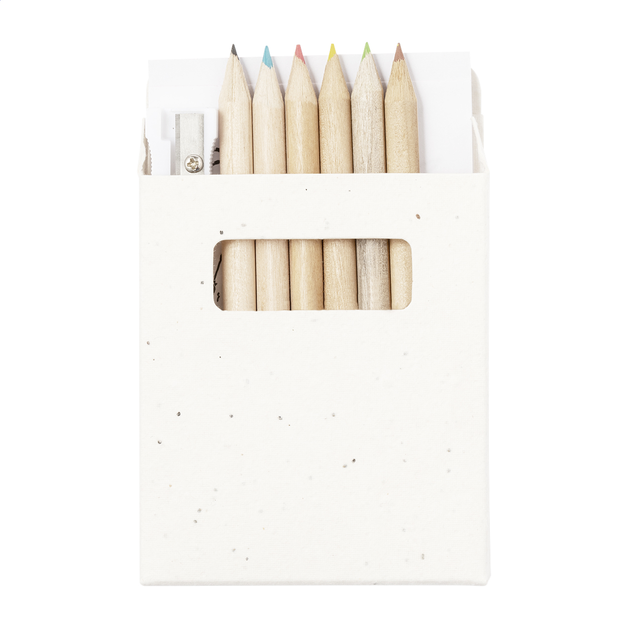 Sada na vybarvení v papírové krabičce se semeny. Včetně 6 dřevěných pastelek, ořezávátka a 20 listů omalovánek. Papírová krabička obsahuje semena petúnie v různých barvách, která lze po použití zasadit.
