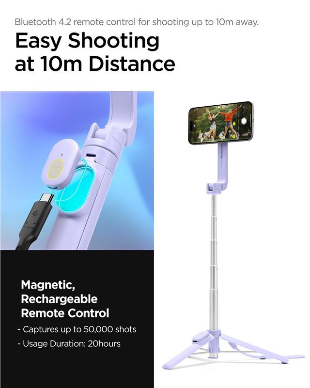 Vestavěná trojnožka se silikonovými prvky poskytuje pevnou základnu pro statické záběry v interiéru i venku. Odnímatelné Bluetooth ovládání usnadňuje fotografování bez nastavování samospouště a magnetický kroužek zajišťuje univerzální využití pro různé smartphony.