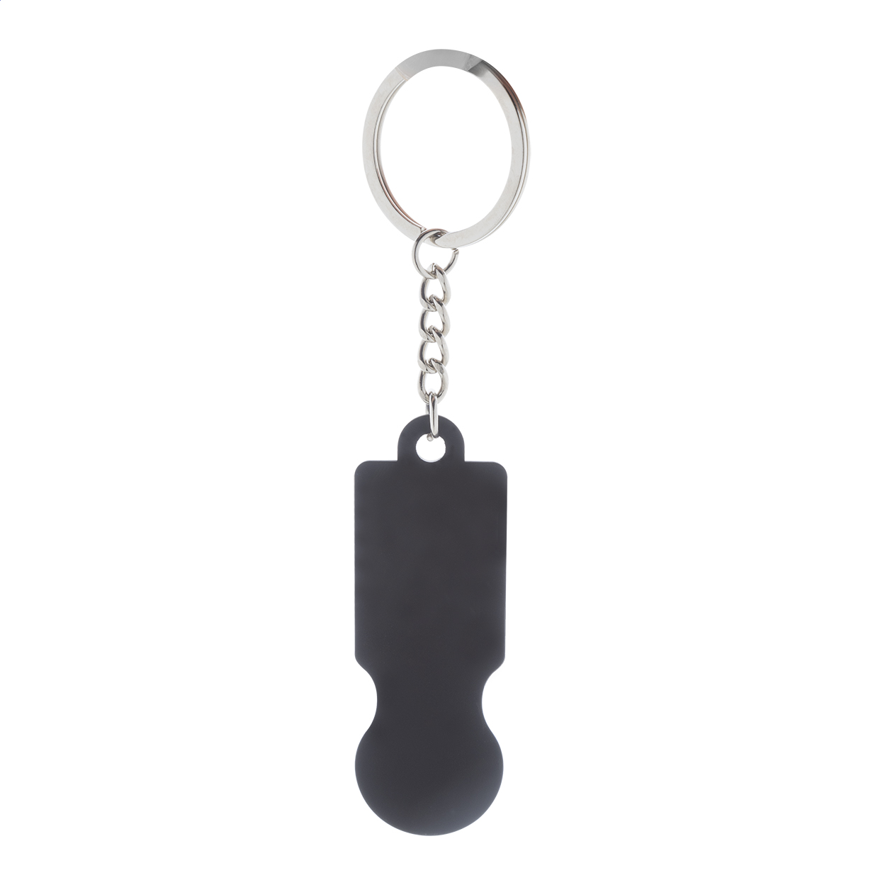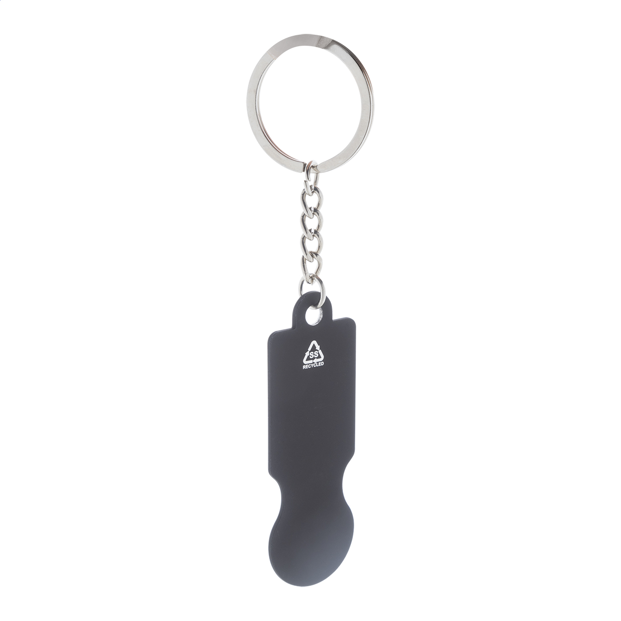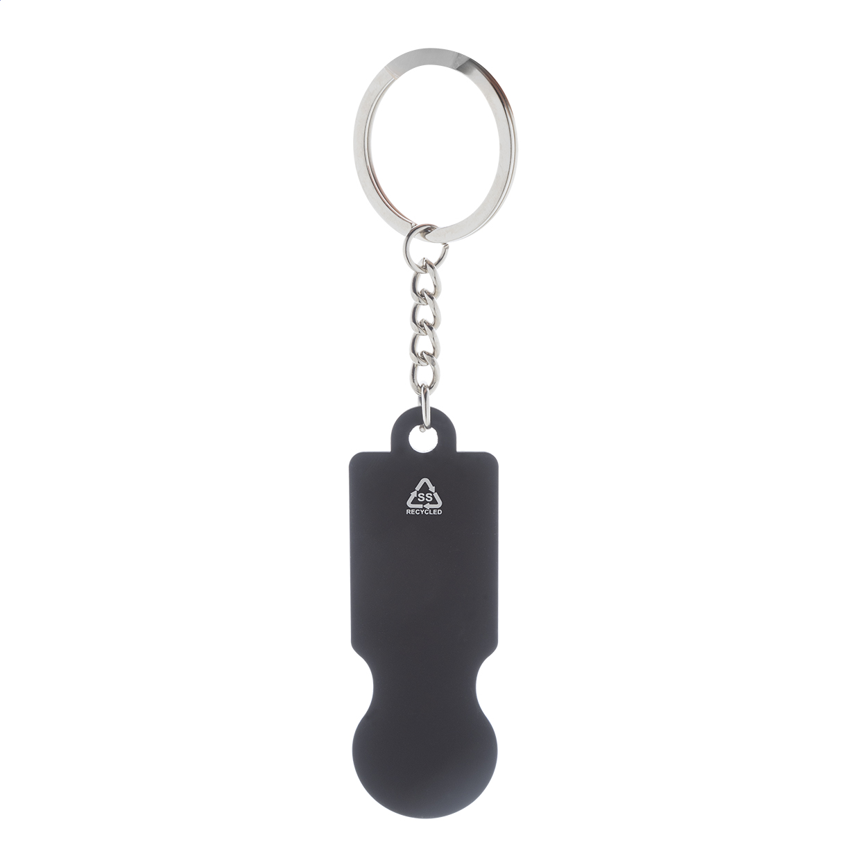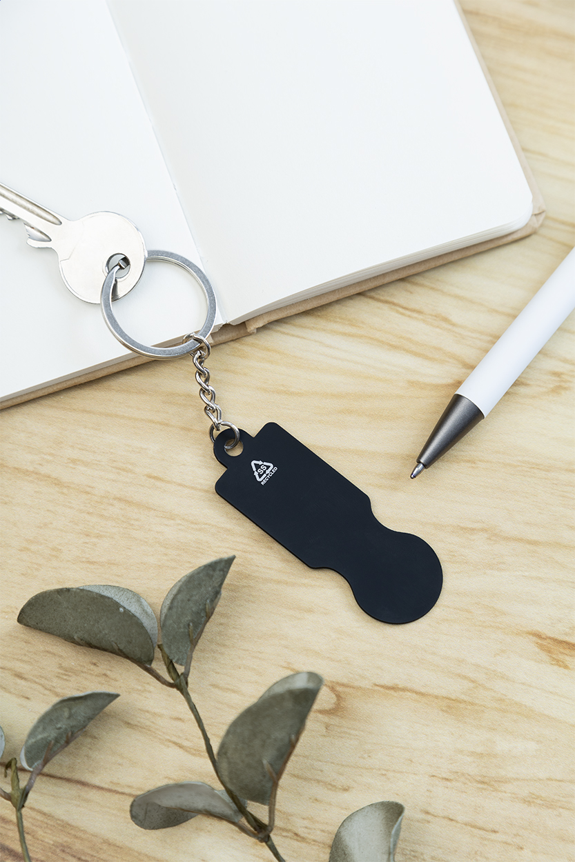 Přívěšek na klíče z recyklované nerezové oceli s pogumovaným povrchem a žetonem do nákupního vozíku. Se speciální vrstvou pro zrcadlové laserové gravírování.