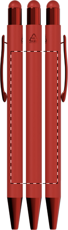 Elegantní červené kuličkové pero z recyklovaného hliníku zaujme příjemným pogumovaným tělem a lesklými kovovými detaily. Horní část s dotykovým zakončením umožňuje precizní ovládání displejů chytrých telefonů nebo tabletů bez šmouh a otisků prstů.