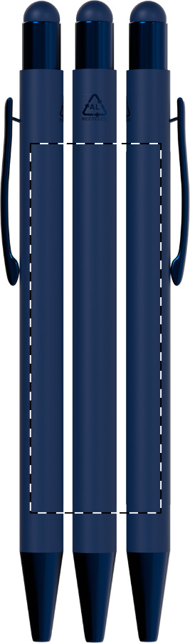 Moderní modré kuličkové pero s dotykovým hrotem představuje spojení klasické psací potřeby a stylusu pro digitální zařízení. Recyklované hliníkové tělo s hebkou pogumovanou úpravou zaručuje pevný úchop a vysoký komfort i při dlouhém psaní poznámek.