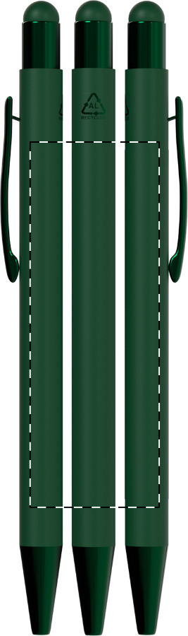 Elegantní zelené kuličkové pero z recyklovaného hliníku zaujme na první pohled pogumovaným tělem, které zajišťuje maximální komfort při psaní. Horní část zakončuje praktická dotyková ploška pro ovládání displejů chytrých telefonů a tabletů, čímž účinně předchází vzniku šmouh na obrazovce.