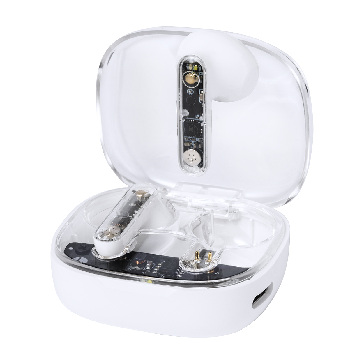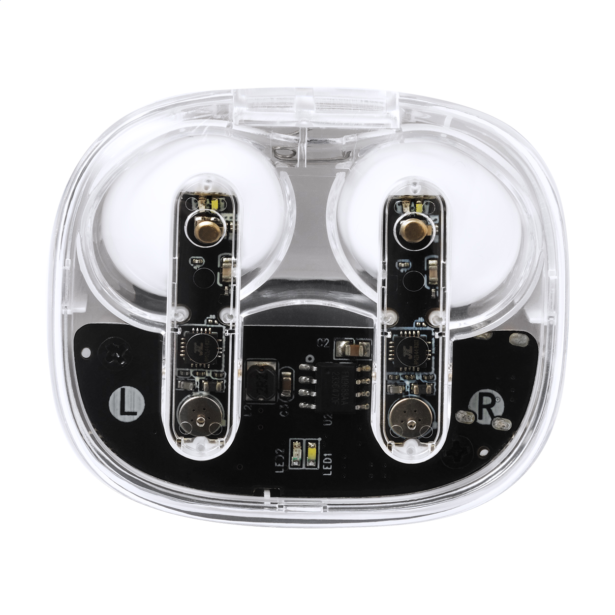 Poloprůhledná, skutečně bezdrátová stereofonní sluchátka (TWS) s viditelnými elektronickými součástmi a funkcí hands-free volání. V poloprůhledném plastovém pouzdře s nabíječkou. Včetně nabíjecího kabelu USB.