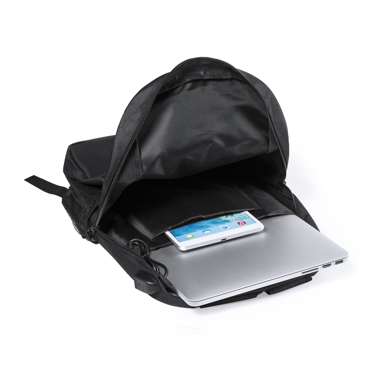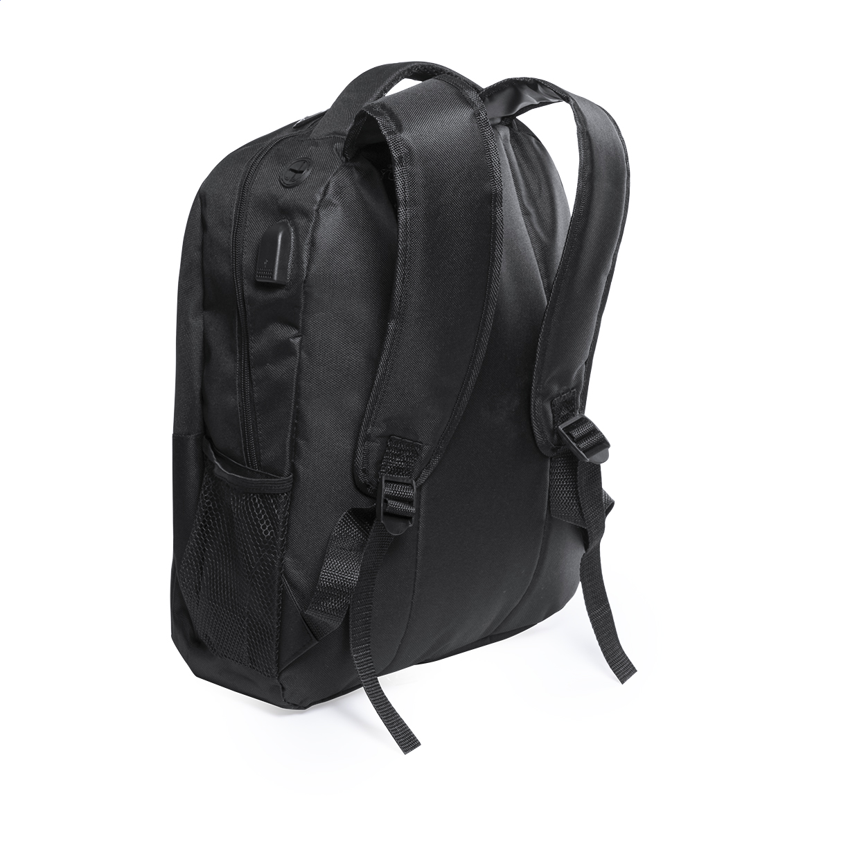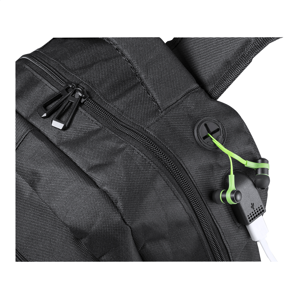 Voděodolný batoh s přihrádkami na zip, polstrovanou přihrádkou na laptop (až 15 palců) a tablet (až 10 palců) a polstrovanými ramenními popruhy. Výstup na sluchátka a vestavěný USB port pro připojení powerbanky. 600D polyester.