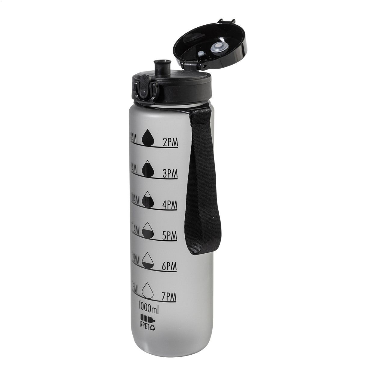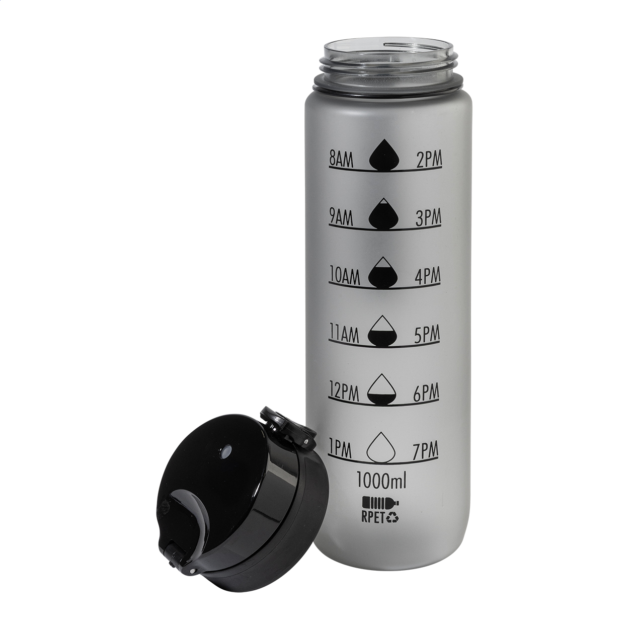 Sportovní láhev z matného RPET s motivačním objemovým a časovým značením, s automaticky otevíratelným odklápěcím víčkem s bezpečnostním zámkem a poutkem na nošení. 1000 ml. Bez BPA. Nevhodné pro sycené nápoje.